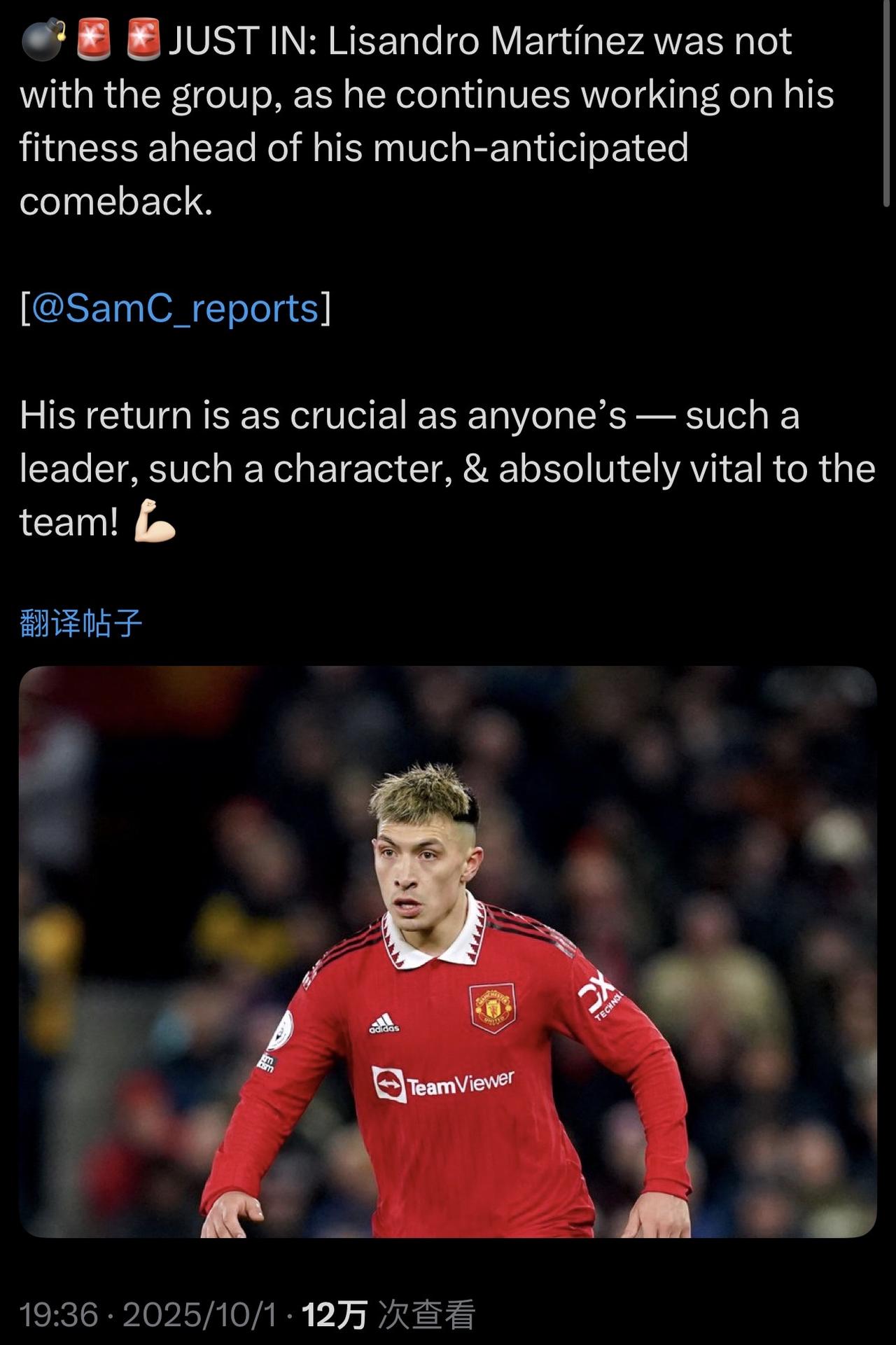 利马付出依然无法确定时间。 🔴利桑德罗·马丁内斯没有和球队在一起,因为他依然在单独的进行身体康复训练。 🔵说实话,利马付出,也不会根本性改变什么问题,还是让他好好的安心养伤吧。