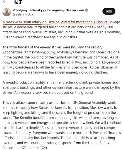 俄军持续空袭12小时,大火烧到第二天早上 28日泽连斯基在社交媒体上发文称,27日晚俄罗斯对乌克兰全境发动了一场持续12小时的大规模空袭,基辅、扎波罗热和赫梅利尼茨基多地遭到袭击。 俄军这次出手特别狠,一下子就用了近 600 架无人机,还有 40 多枚导弹,里头甚至有昂贵的 “匕首” 高超音速导弹。 要知道战争刚开始那阵,俄军每次空袭也就放十几架无人机,导弹更是舍不得用,现在能一口气砸这么多,明显是武器生产跟上了,就是要让外界看看,打了三年多,他们的军工产能不光没垮,反而越来越强。 这跟欧洲那边形成了鲜明对比,欧洲国家自己造不出足够的武器,还得花大价钱从美国买了送乌克兰,俄军这是故意亮肌肉给北约看。 更巧的是,空袭前一天,泽连斯基刚承认以色列送了一套 “爱国者” 防空系统过来,德国也说要再加送两套,算下来乌克兰很快能有 11 套,本来以为能把大城市护得严严实实。 结果俄军紧接着就发动空袭,直接给了这套新系统一个 “下马威”。基辅的防空部队确实拼命拦截了,说追踪到了 600 多个目标,也打下来不少,但没用,该被炸的还是炸了。 更憋屈的是,有些 “爱国者” 导弹没拦住俄军的目标,反而落下来炸了自己的居民区,公路上、居民楼废墟里全是拦截弹的残骸。 乌军解释说是俄军先用大量无人机当诱饵,骗得防空系统乱开火,导弹升空后找不到目标,没动力了就砸向地面,但不管怎么说,新防空系统没起到预期作用是真的。 基辅受的打击最重,已经确认有 4 人死亡,其中还有个孩子,80 多人受伤。遭殃的不光是民房,连欧洲有名的斯特拉热斯卡心脏病学研究所都被炸了,里面两个人没跑出来,建筑也严重受损。 俄军国防部自己说了,这次就是奔着军工企业和军用机场去的,还打了存放无人机、无人艇的仓库,以及外国雇佣兵住的地方,声称所有目标都击中了,效果很明显。 这话不是吹牛,哈尔科夫州那个旧康斯坦丁诺夫机场,存放 F-16 战斗机的机库就被 “匕首” 导弹炸塌了,乌克兰盼星星盼月亮等来的战机,还没来得及起飞就成了废铁。 俄军这招很毒,就是要掐断乌克兰的 “造血能力”—— 把兵工厂炸了,乌军没武器造;把机场毁了,西方送的装备没法落地;把能源设施打了,前线的燃料和弹药都运不上来,这是想从根上削弱乌克兰的抵抗能力。 这里头还有个关键背景,就是美国那边的动静。有消息说特朗普可能会给乌克兰送 “战斧” 巡航导弹,那玩意儿能打很远,连莫斯科都能得着。 这种敲山震虎的心思,明眼人一看就懂,毕竟 “战斧” 要是到了乌军手里,俄军的本土安全就得受威胁,他们必须提前亮出态度,让西方不敢轻易松口。 面对这么猛的空袭,泽连斯基放话说要反击,乌军确实也动手了,一天之内往俄罗斯别尔哥罗德地区派了 130 多架无人机,炸了 55 个居民点,伤了 9 个人。 但这反击跟俄军的空袭比起来,力度差太远了,俄军一天就击落了 230 架乌军无人机,地面设施几乎没受影响。 俄罗斯总统新闻秘书佩斯科夫说得挺直接,说乌克兰明明处境越来越差,还不找机会和谈,光靠虚张声势没用。 这话虽然刺耳,但看看现实,乌克兰现在征兵都要靠抓壮丁,18 到 60 岁的男人出门都怕被带走,西方援助也没以前积极,F-16 迟迟不到位,弹药缺口越来越大,确实没多少资本跟俄军硬耗。 这场空袭选的时间也有讲究,刚好在联合国大会闭幕没多久。全世界刚开完会喊完 “停火”,俄军就发动这么大规模的打击,摆明了是不把国际舆论当回事。 他们就是要告诉所有人,战场上的输赢得靠拳头说话,联合国的决议、西方的谴责,都不如导弹和无人机管用。 北约国家虽然紧张,波兰还加强了空军巡逻,在边境部署了更多坦克,但也没谁敢真的派兵介入,毕竟谁都不想把自己拖进这场没头的战争里,欧洲国家更怕俄军报复,断了他们的能源供应。 战争打了三年多,早就不是什么 “领土争端” 那么简单了,成了拼耐力的 “绞肉机”,政客们在谈判桌上吵来吵去,受苦的都是这些只想好好过日子的人。 俄军这次空袭确实达到了目的,既展示了自己的武器产能,又试出了乌克兰防空的漏洞,还警告了西方。 但火能烧灭建筑,却烧不掉抵抗的心思,泽连斯基虽然焦头烂额,还是在视频里喊着要坚持下去,乌克兰老百姓也在废墟上搭起临时帐篷,整理能用的东西。 只是基辅的火灭了,别尔哥罗德的烟又起来了,乌军的无人机还在往俄罗斯境内飞,俄军的导弹也随时可能再落下,这场仗不知道还要打多久。 这场 12 小时的空袭就像一面镜子,照出了战争的残酷,也照出了各方的算计。 基辅的火虽然慢慢灭了,但冲突的 “火” 还烧得旺,接下来的日子,乌克兰的防空系统还得靠西方补,俄军说不定还会有新的空袭,而那些失去家园的人,只能在废墟里盼着和平早点来。