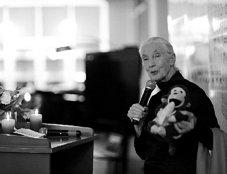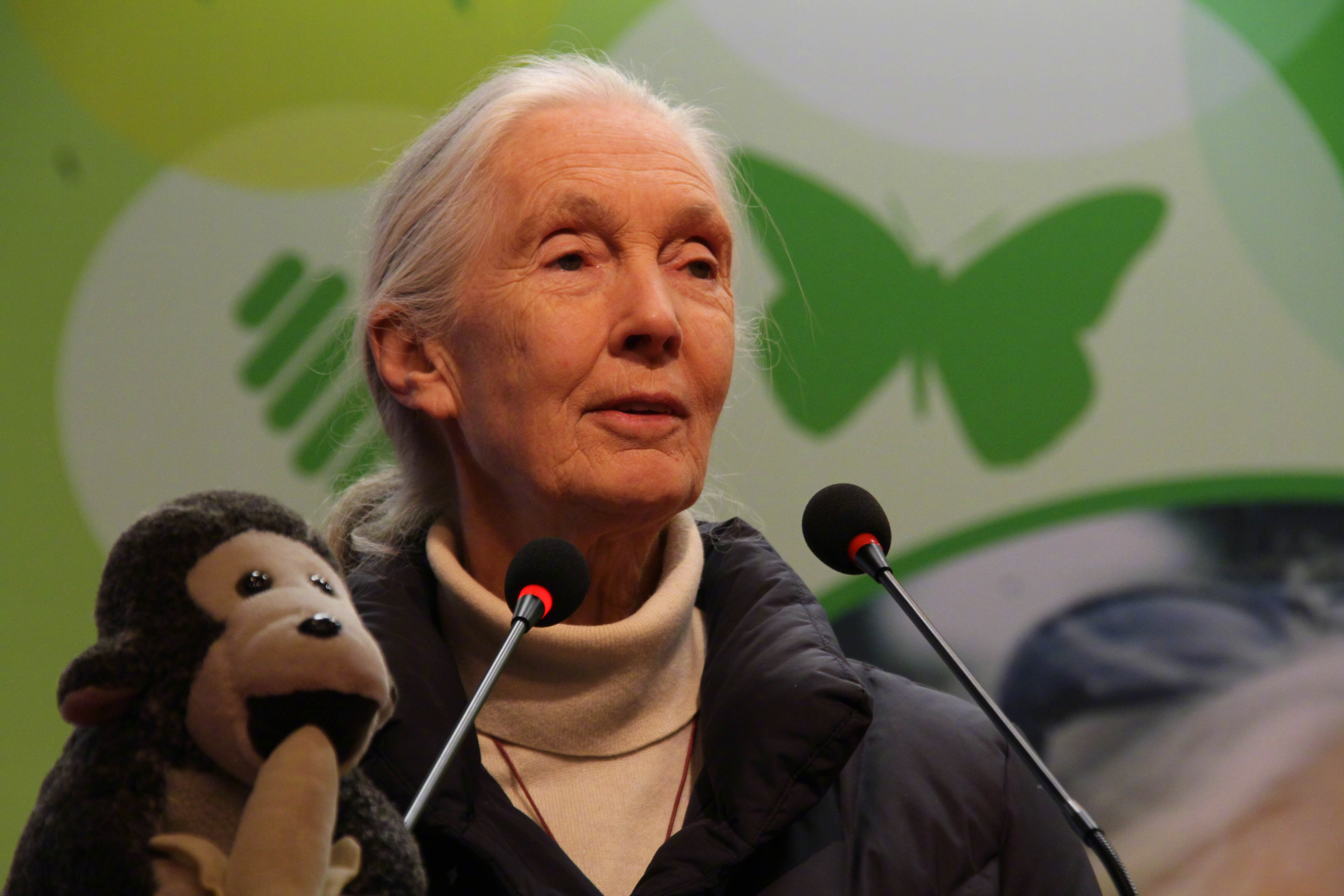 珍·古道尔长期带着一只毛绒玩具猴环游世界,以提高公众对生物多样性所遭受破坏的认识,并敦促公众采取行动应对气候变化。