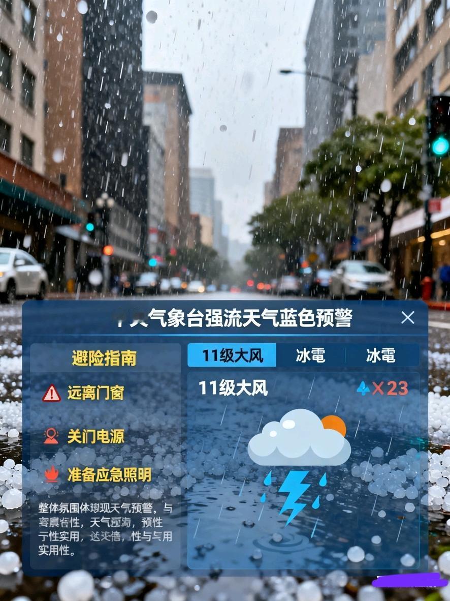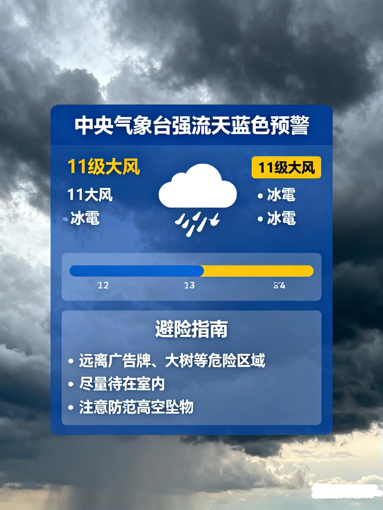 中央气象台发蓝色预警!多地将遭11级大风+冰雹,这份避险指南快存好 中央气象台最新发布强对流天气蓝色预警,一场“狂暴天气套餐”正逼近多地,涉及江淮、江南、西南等多个区域,关乎千万人的出行与安全,这些关键信息一定要提前看清。 此次强对流威力不容小觑:江苏中南部、上海北部等地区将遭遇10级以上雷暴大风,最大风力可达11级以上,堪比台风过境;江苏、上海部分区域短时强降雨小时雨量将超50毫米,最高可达60毫米,积水可能瞬间没过车轮。更危险的是,部分地区还可能伴随冰雹,玻璃、车辆都可能被砸损。 强对流天气主打“突袭”,主要影响时段集中在午后至夜间,正是市民下班放学、户外活动的高峰。别以为“蓝色预警”威力弱,它带来的短时大风能轻易吹倒广告牌,短时暴雨易引发城市内涝,山区还可能出现滑坡、泥石流等次生灾害。 这份避险指南必须记牢:户外人员要立即远离棚架、广告牌等搭建物,千万别在大树下躲雨或靠近高压电线;驾车遇到积水别强行通过,车辆熄火要立刻弃车逃生[__LINK_ICON]。在家要关好门窗,拔掉电器电源,将车辆停进地下车库,避免露天停放被冰雹砸坏。 山区居民需密切关注水位变化,一旦发现山体有松动迹象,立即向灾害前进方向的两侧山坡撤离,切勿沿沟谷逃跑。农业从业者要赶紧加固棚舍,将家禽牲畜赶入室内,减少财产损失[__LINK_ICON]。 强对流天气虽凶猛,但提前防范就能大幅降低风险。转发给家人朋友,做好应对准备,才能从容躲过这场“天气突袭”。 北京冰雹预警 雷雨冰雹 突降暴雨加冰雹