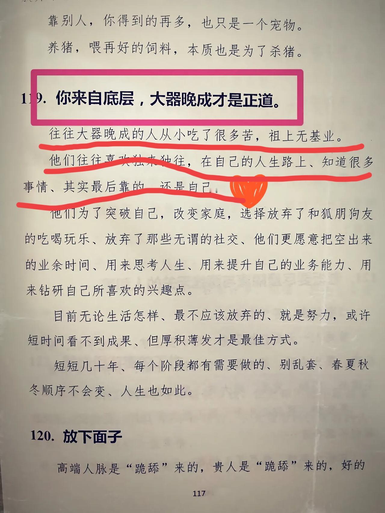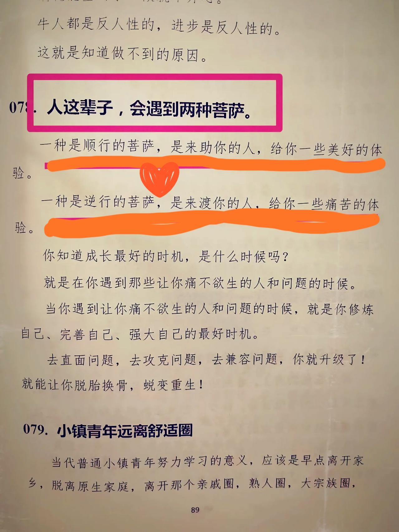 世上缘分就像西游记,磨难没受够,贵人在眼前也没用。缘未到你就不可能遇到给你解决问题的人。 很有感触。曾经莫名其妙地不能走路,三年间大大小小的医院,名医都去看了,各说各的,最后在八一康复中心遇到一个临时顶班的实习医生,很细致的看了我的检查报告,教我怎么锻炼,后面没吃药了,就锻炼,慢慢就恢复了。那三年间医院各种治疗方法都试了个遍,扎了几万针针灸,被扎伤两次,给姚明刘翔治病的国家级的医生都没治好。后面我常常说:罪没受完就好不了。 一切都是最好的安排,时机到了,贵人自然来。 底层大器免成才是阳光大道。 人在弱势的时候,千万不要玻璃心! 曾仕强老先生说:“好的磁场都是相互吸引的,要得到贵人的相助,先要把紧锁的眉头打开,把自己打扮的光鲜一点,把家里收拾的干净一点,把心情调整的平静一点,不要让自己表现出消极的气质,贵人自然都会向你靠近。” “人争一口气,树活一张皮” 无论何时何地你的精气神都不能丢。当你丢掉幻想、无依无靠时,潜力才会被激发到最大。 人只有触底反弹才会否极泰来。触底才会想明白很多东西,才有了后面的厚积薄发, 多跟会赚钱的人做朋友。钱的背后藏着一个人的认知、自律、圈子、能量、格局,还有他的执行力。你依旧需要培养起或者发展好人脉资源杠杆的核心运用能力,这,才叫真正的拨云见日。不依靠那些早就已经积累雄厚资源的前辈给你指点明路,你绝对这辈子就不会稳稳抓得住那本属于你但又最容易被你忽视的机遇与财富。 见之高峰 ,如临深渊。 唯有平安 ,方可享乐。