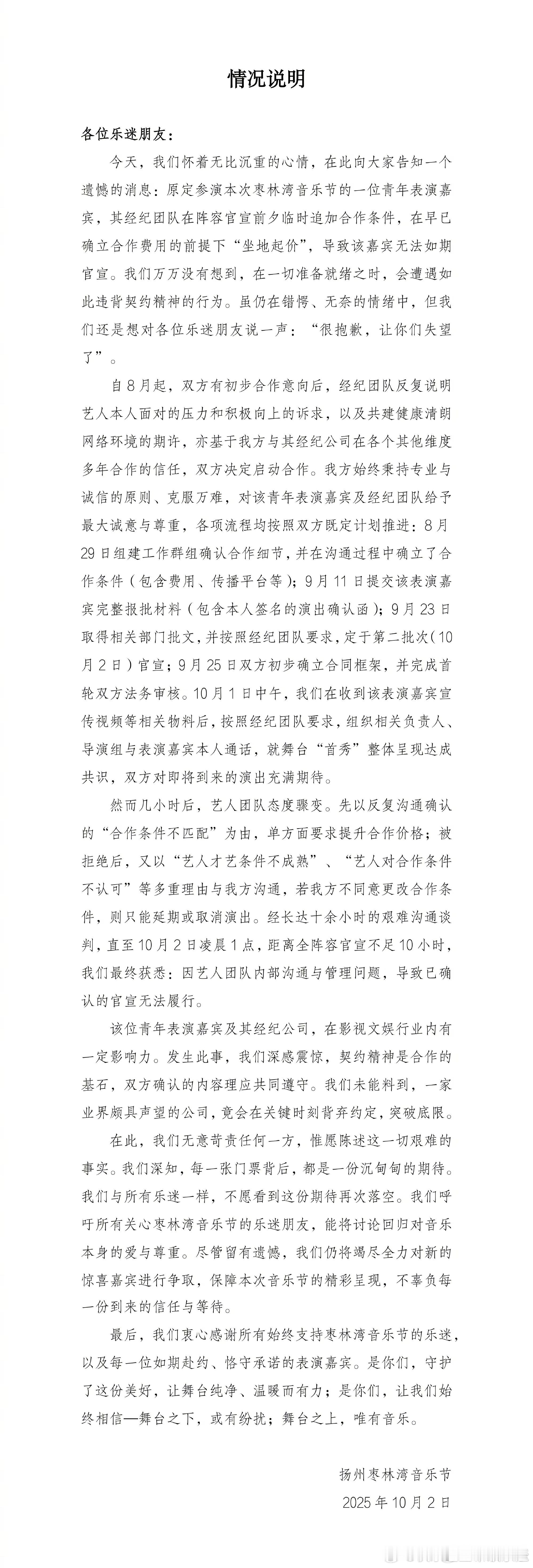 枣林湾音乐节曝艺人在阵容官宣前临时追加合作条件、在已确立合作费用的前提下“坐地起价”,导致无法官宣。