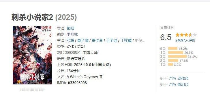 《刺杀小说家2》豆瓣开分:目前24697人打分,6.5分。丁程鑫演的怎么样 大家都去看了吗[期待][期待][期待][期待]