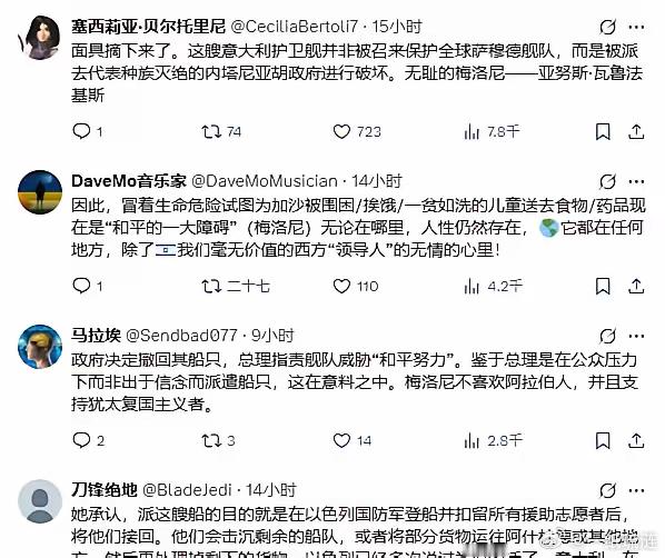 梅拉妮承认,派这艘船的目的就是在以色列国防军登船并扣留所有援助志愿者后,将他们接回。他们会击沉剩余的船队,或者将部分货物运往阿什杜德或其他地方,然后再处理掉剩下的货物。以色列已经多次说过类似的话了。意大利在这件事上,真是大错特错。