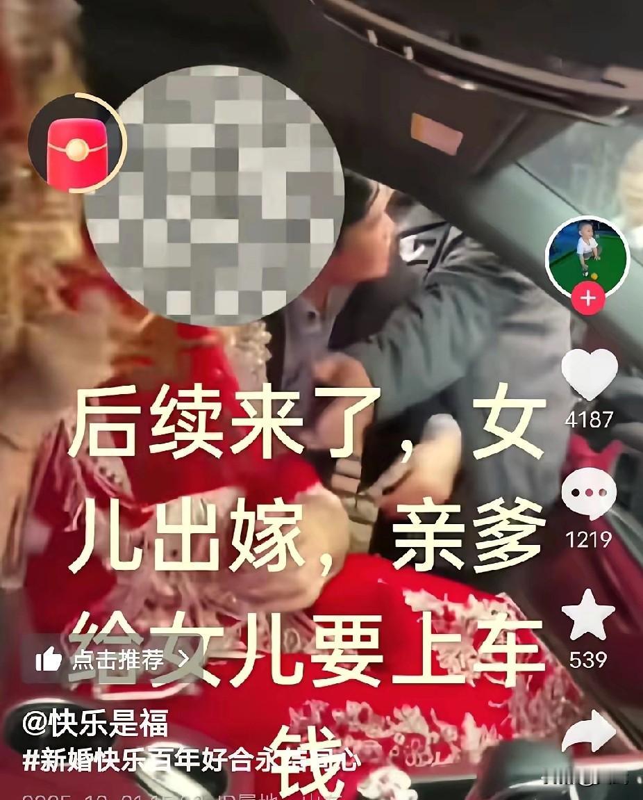 婚车即将启程,父亲却突然拦在车前,涨红着脸索要上车礼。新娘含泪拒绝:28万彩礼您一分没给,现在又来要钱?围观人群窃窃私语,喜宴的气氛瞬间凝固。 父亲当年用彩礼给弟弟买房,如今却理直气壮地讨要上车礼,彻底寒了女儿的心。新娘最终关上车门,婚车扬长而去,留下父亲独自愣在原地。这场婚礼,没有祝福,只有亲情的破碎。