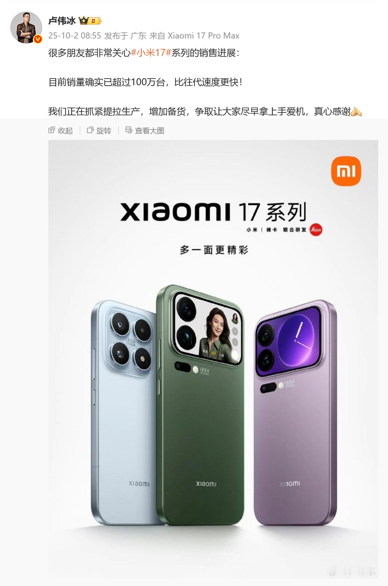 小米17系列销量破百万卢伟冰确认,小米17系列销量破百万。总结背屏爆火的原
