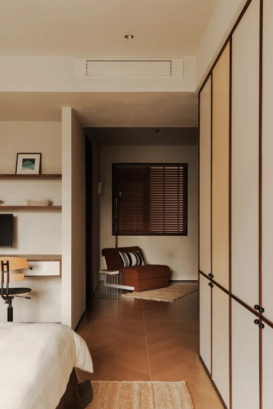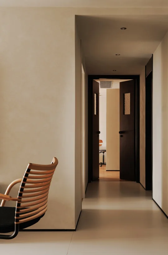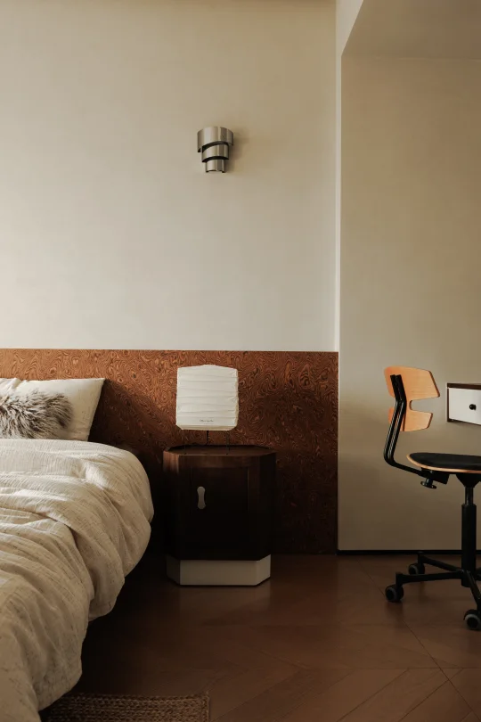 1️⃣材质基调:胡桃木的表达 - 大面积运用纹理低调、质感哑光的胡桃木,将木色的温润与高级感发挥到极 致,奠定了空间沉稳、内敛的基调。