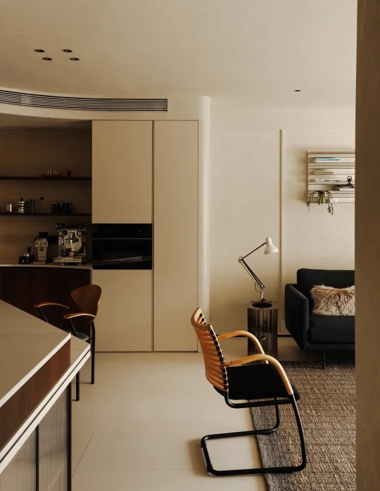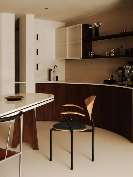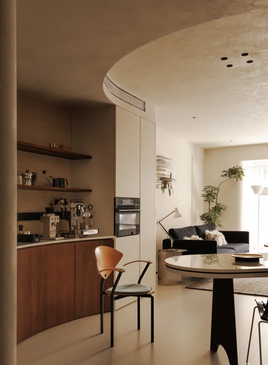 2️⃣造型巧思:双弧形结构破局 - 通过定制化的弧形餐边柜与弧形餐桌形成巧妙呼应,一举打破原始户型的常规与生硬,赋予空间流动的雕塑美感与独特个性。