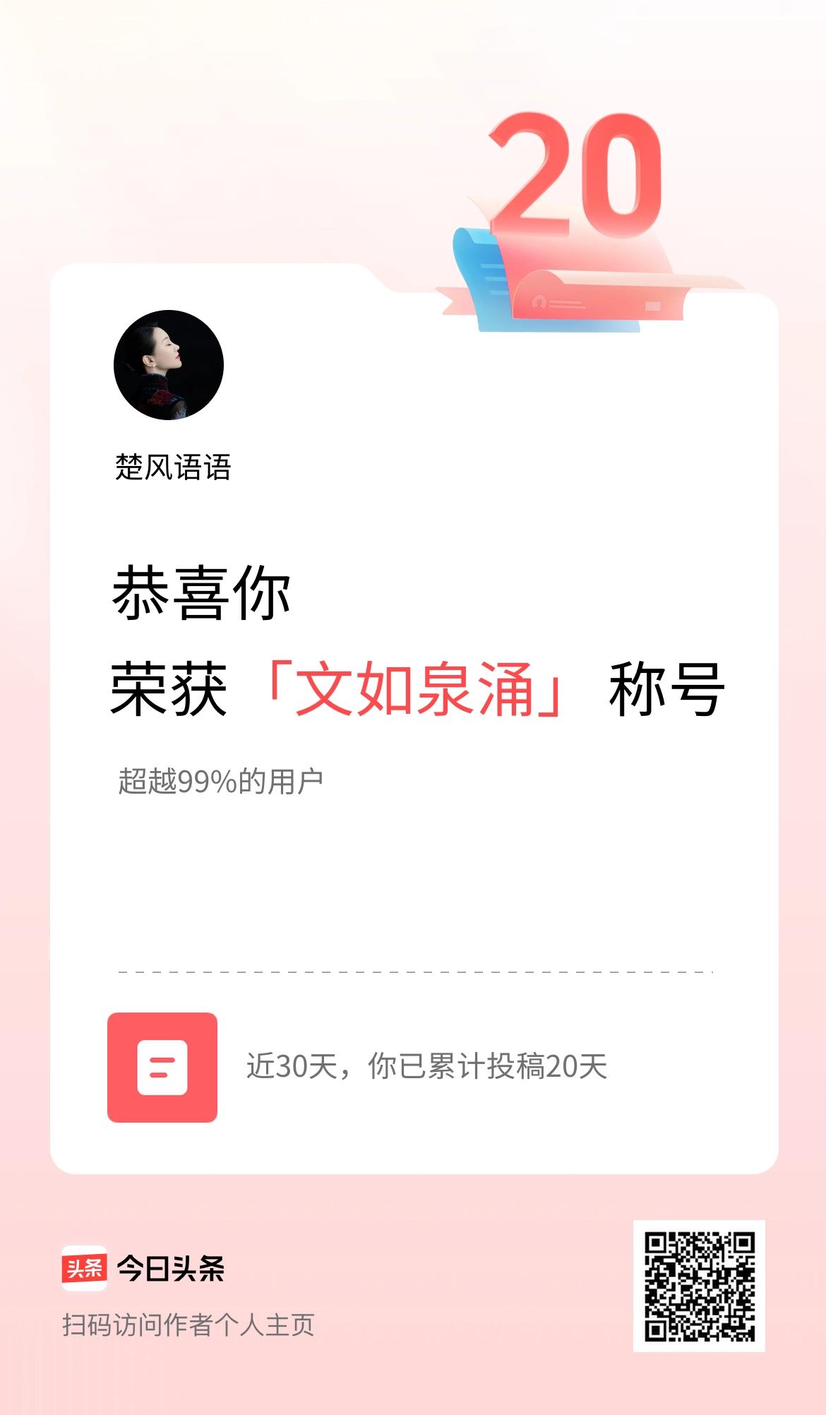 我在头条30天内投稿打卡20天,获得“文如泉涌”称号