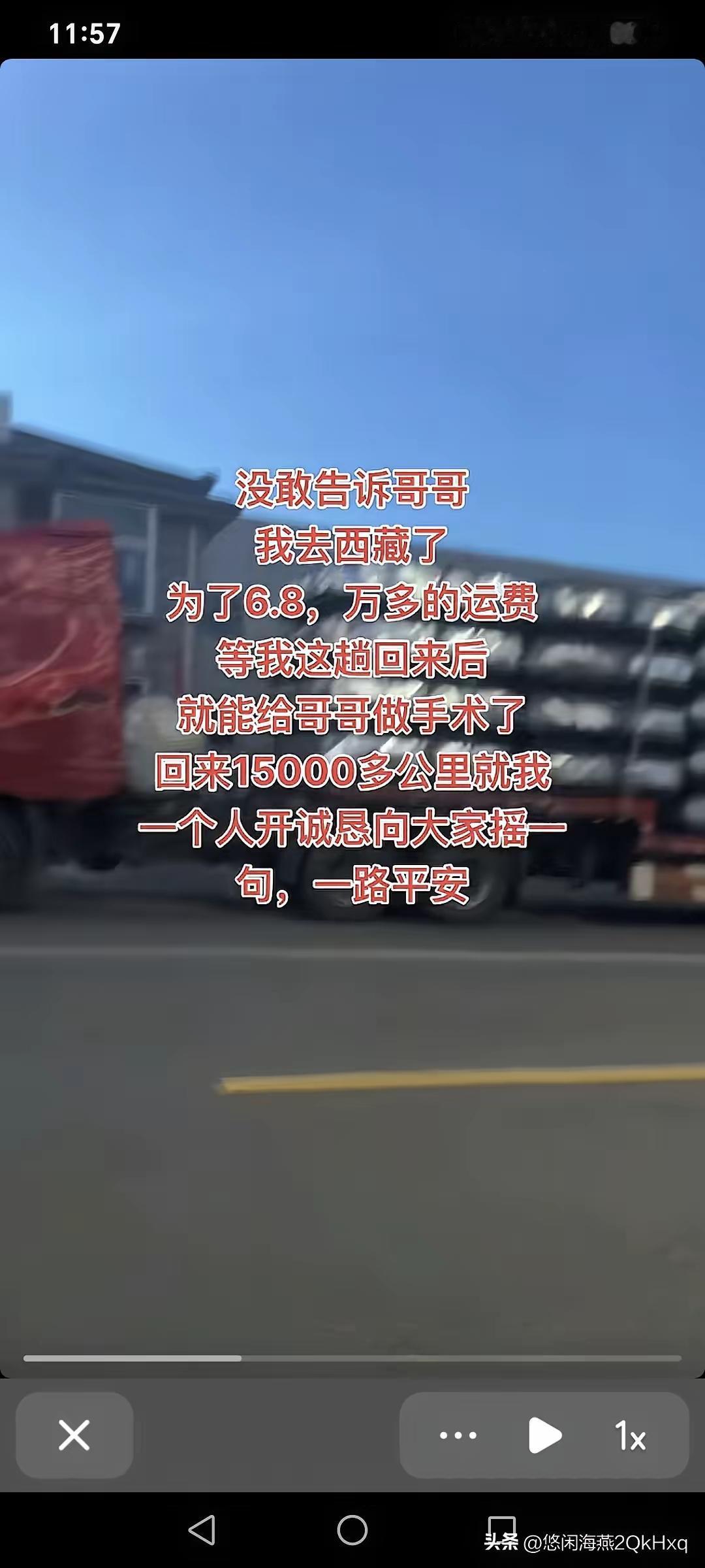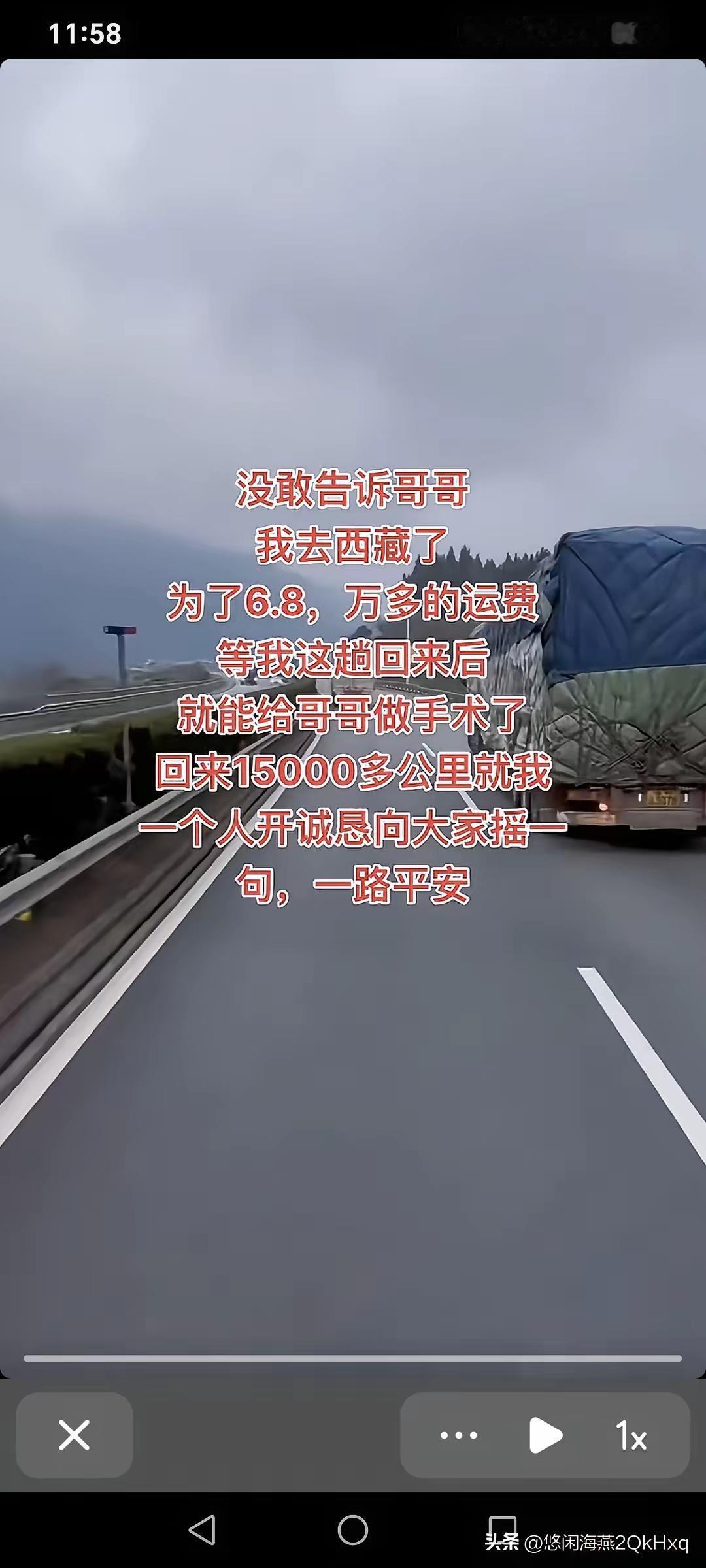 一网友没敢告诉哥哥他去西藏了,为了六万八的运费,等他这趟回来后,就能给他哥哥做手术了,回来一万五千多公里就他一个人开,诚恳向大家摇一句一路平安! 一路平安,越来越好,菩萨说,你的灾难已过完了,后边的路上都是爱和财! 网友评论: 已经帮你祈祷了,各路神仙都回复说了,你这趟顺风顺水,财源滚滚,家里哥哥不久也会康复,一切顺利。 一路平安,走来越好!手足情深,为了哥哥手术费用,上西藏来回一人开,很危险的,多带点氧气瓶,好运连连,顺风顺水! 已经帮你祈祷了,各路神仙都回复说了,你这趟顺风顺水,财源滚滚,家里哥哥也会不久康复,一切顺利。安心驾驶,红景天提前吃,氧气瓶备着点。 看的我心疼,没有基础家庭的孩子,往往都是靠拼命闯过来的,太不容易了,平平安安,健健康康的归来,我帮你祈祷,就冲你对哥哥的一片心,老天和看到你信息的人都会保佑你的!