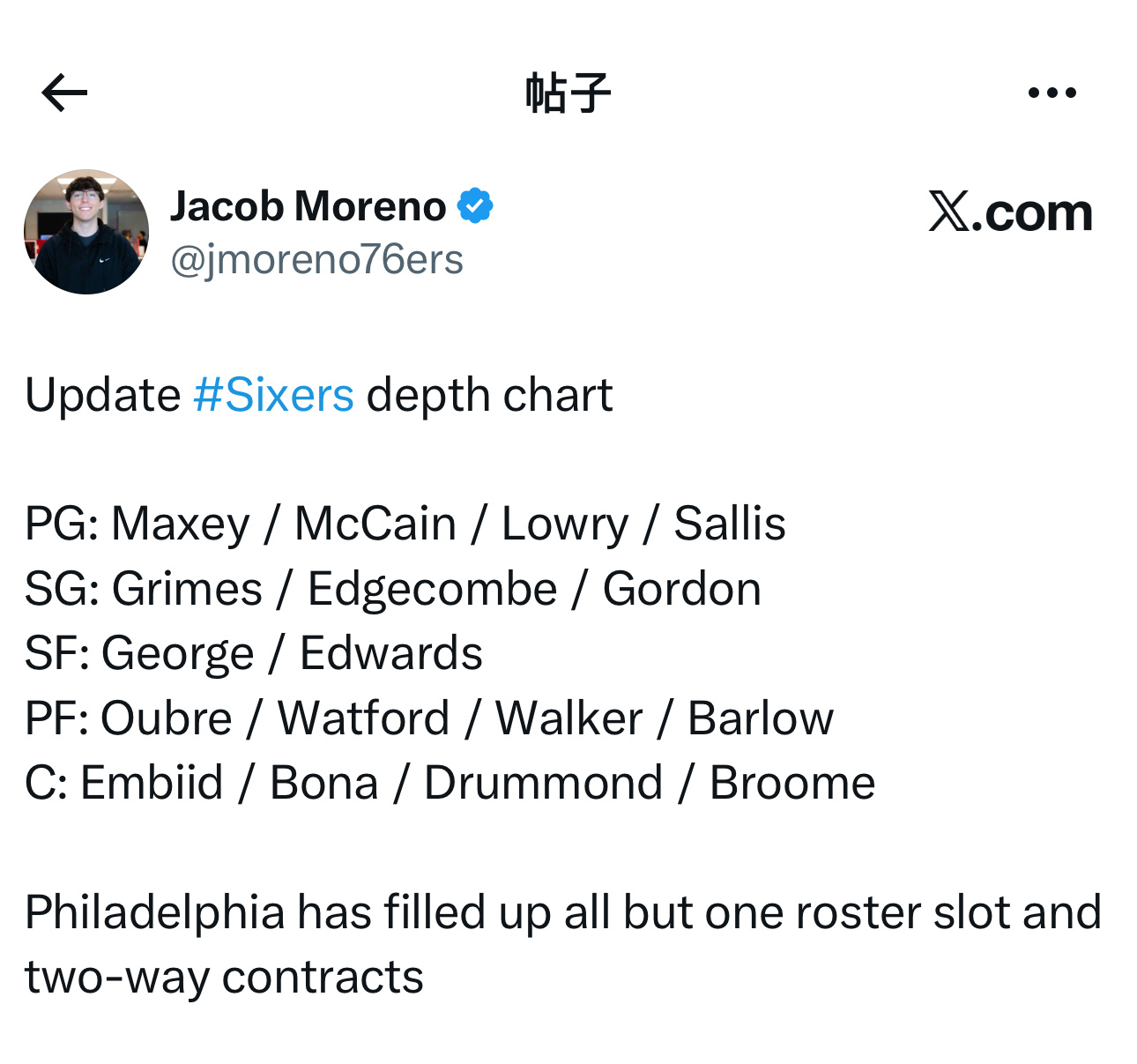 费城76人队新赛季阵容名单一览(含双向合同)[围观]