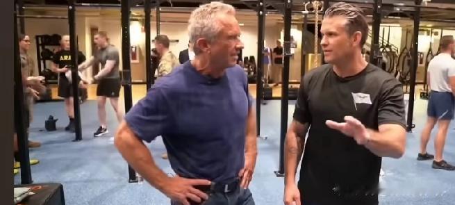 谁能想到,美国的部长们卷到健身房了!卫生与公共服务部长小罗伯特·F·肯尼迪,直接给国防部长皮特·赫格塞斯下了战书——搞了个“皮特和鲍比挑战”,规则简单粗暴:5分钟内搞定50个引体向上加100个俯卧撑。 按常理说,45岁的赫格塞斯正值壮年,赢面本该稳如泰山。结果没想到,71岁的小肯尼迪硬是没让人失望,虽然用时5分25秒,比赫格塞斯的“刚过5分钟”慢了23秒,但这差距小到几乎可以忽略不计。 要知道,一个管国防、天天跟“硬核”事务打交道,一个管卫生、日常围着公共健康转,俩人凑一块比体能,活脱脱像俩不服输的大叔在健身房较劲儿,场面又严肃又好笑,估计围观的工作人员都忍不住想喊“加油”。