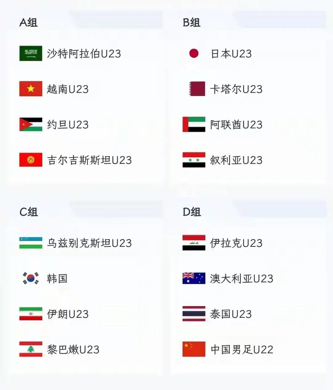 中国U23国足亚洲杯抽签结果刚刚出炉,中国队再遇澳大利亚,这次东道主沙特终于没有再选择中国队,沙特队还是知道这批中国U23不好对付,种子队碰伊拉克,最弱对手碰上泰国,中国队这个签还算可以吧! 中国U22国足10月在昆明海埂集训,2场热身赛对手就是泰国U22,真的太巧了,想不到2队真分到一组了,这下好了,两队可以真刀真枪提前干2回了,看看谁厉害,让我们拭目以待吧! U23亚洲杯将在明年1月7号到25号在沙特举行,希望安东尼奥能带中国队取得好成绩,让我们拭目以待吧!