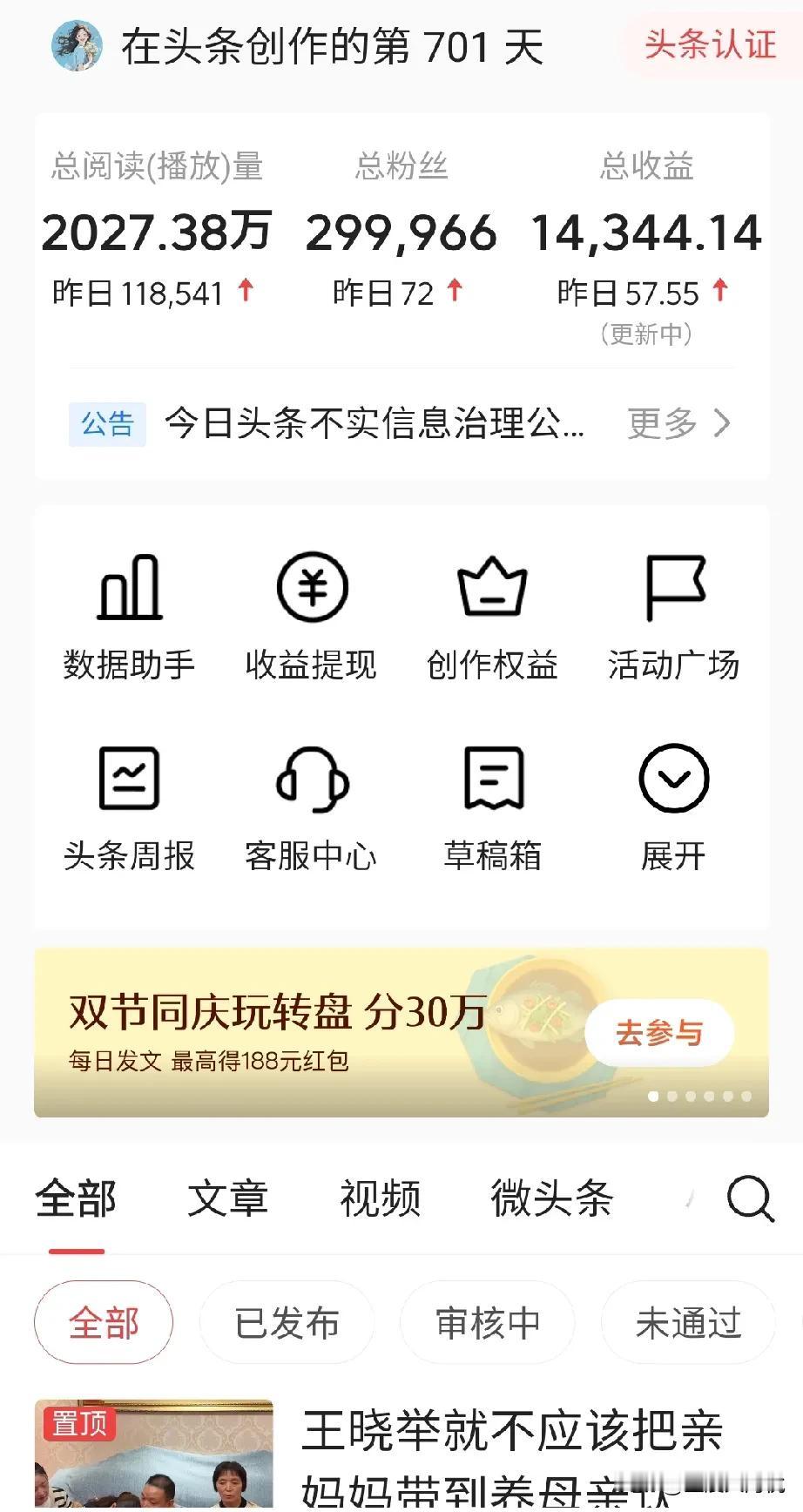 这是最近两个月以来收益最高的一天, 阅读量也是最高的一天, 明天能不能继续这样还是一个未知数, 你别看我29万粉丝,收益跟粉丝多少根本没有关系, 而是跟你的文章,小作文有关系, 主要看你写的那玩意儿有没有产生大家共鸣之处。 这个是关键, 其次就是质量,阅读时长,阅读时长越长单价就越高, 就像(素老三)那样,我看了她写的每篇大约有1000多字,阅读时长最少2分钟多, 像我这样11万的阅读量,人家起码最少得挣个400—500之间。