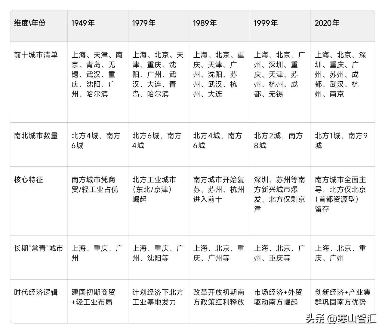 今天在山里露营的时候,突然看到这张中国城市GDP前十的变迁表格,感到十分的感慨!东北啊,天津啊! 1949年,上海、天津、南京等城市霸榜,南方凭商贸轻工业占了6席;到1979年,北方工业城市(沈阳、哈尔滨等)崛起,北方占6席把南方压成4席。可没几年到1989年,南方又扳回6席,苏州、杭州开始冒头;1999年更夸张,深圳、苏州爆发,南方直接占8席,北方只剩京津俩“独苗”;2020年再看,北方仅北京(还带首都资源属性)1城,南方9城全面主导。 这七十多年,城市榜单像被时代浪潮反复冲刷——沈阳、哈尔滨这些曾经的工业明星,慢慢在前十里没了姓名;深圳、苏州这些“后起之秀”,却靠着改革开放、外贸红利冲进榜单。但你发现没?上海、重庆、广州这几个名字,居然在每一个年份里都“钉”在前十里,成了浪潮里的“锚点”。 有人说北方城市没落可惜,可换个角度想,这恰恰是时代变化的注脚。计划经济时代需要重工业基地,北方站C位;市场经济、创新经济时代,南方的灵活与敢闯更适配,于是南方领跑。就像网友说的:“沈阳的机床曾是国家骄傲,可深圳的科创现在更接时代地气。” 其实不止城市,我们的生活也是如此:以前觉得“铁饭碗”能端一辈子,现在自由职业、灵活就业成常态;以前逛街买衣服,现在直播下单成日常……变化从不停歇,就像表格里的城市排名,今天的“辉煌”可能是明天的“过去式”,但只要像上海、重庆那样,抓住时代的“脉搏”(商贸、产业升级),就能在变化里找到自己的位置。 所以啊,别害怕变化,毕竟变化才是永恒的。你看这些城市,在变与不变里折腾了七十多年,反而活出了更鲜活的模样。