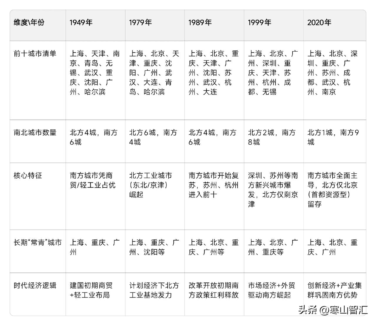为什么说北方城市的经济十强“失势”,藏着时代的残酷真相? 你看看这份榜单是不是很有特点,北方城市曾经靠工业“霸榜”,看起来特别硬核,但是也为后来的转型埋下了困扰,比如东北城市习惯了工业思维,突然要搞创新经济,就很不适应。 北方城市的工业遗产不少,但是又不能细看,很多老厂区空着没利用,转型思路单一,经济活力越来越弱。 那为什么南方城市比北方城市在经济十强里更“常青”? 先看时代机遇差异。南方城市赶上改革开放的“头班车”,深圳、杭州这些后起之秀能快速崛起,外来投资、政策试点都先往南方落;北方城市多靠传统工业吃饭,计划经济的“舒适区”待久了,转型时步子迈得慢。就像东北老工业城市,守着老厂房的时候,南方城市已经在搞自贸区、科创园了。 产业标签的影响太关键。南方有互联网、外贸、民营经济这些“新标签”,提起经济活力,大家先想到南方;北方靠传统工业的“旧标签”,工厂多但“藏在过去的辉煌里”,普通人平时感受不到新活力。就像说到新兴产业,想起的是杭州的互联网,却少有人知道北方老工业城市的新产业进展。 发展节奏的差距也明显。电视剧里的深圳速度、上海陆家嘴,让南方成了“活力地标”;北方的老工业基地故事,却少了这类破圈的新时代载体,名气难传得远。 其实北方城市实力不是突然消失,只是南方城市在时代机遇、产业标签和发展节奏上更会“跟紧时代”。 你觉得南北城市的经济十强博弈,最核心的差距在哪?