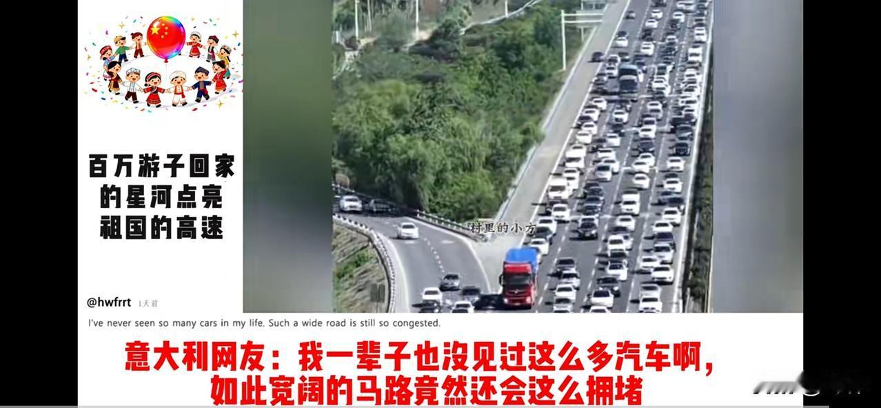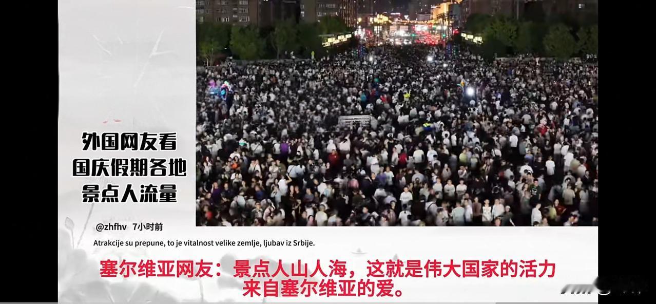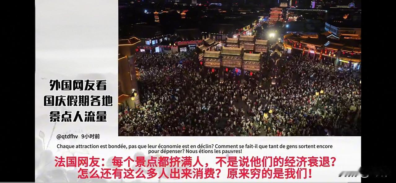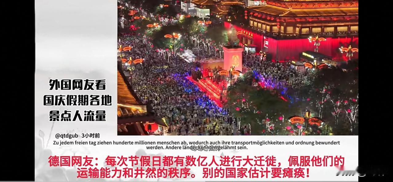 十一国庆和中华盛世让全球网友齐呼万岁(二) 美国网友:中国76周年国庆快乐!中国的进步真是了不起,中国的每一步都是人类的新起点。 阿联酋网友:从未见过如此壮丽的国家和如此璀璨的文明。中国的国庆节,人类未来的开幕式。 巴西网友:中国的每一天都是人类的里程碑和新纪元。中国万岁!巴西人民与中国人民同行! 阿尔及利亚网友:我无法用语言来表达我对中国的热爱,中国的脚步就是世界人民的道路。 美国网友:太讽刺了,为了喜迎他们的国庆,我们的政府宣布了关门。 澳洲网友:看到国庆出游要3亿多人次,惊呆了!这比我们整个国家的人口都多十几倍! 美国网友:中国用3亿多人次的旅行和消费来为自己的祖国庆生,美国用37万亿美元的债务来让自己的政府关门。 美国网友:中国的君临天下和美国的病入膏肓肉眼可见。在所有领域,我们都以令人绝望的差距输给了中国。 法国网友:每个景点都挤满人,不是说他们的经济衰退?怎么还有这么多人出来消费?原来穷的是我们! 塞尔维亚网友:景点人山人海,这就是最伟大国家的活力,来自塞尔维亚的爱。 柬埔寨网友:中华盛世的夜晚是如此璀璨,文明之光和科技之光无处不在,欢乐和幸福处处绽放。 菲律宾网友:中国才是菲律宾人民梦寐以求的祖国!中国7月份一个月的电力就超过菲律宾未来80年的电量! 捷克网友:中华盛世的繁荣昌盛和先进发达让我们这些欧美游客目瞪口呆和目眩神迷! 捷克网友:在无比美好和无比科幻的中国面前,我们像是一群来自17世纪的欧洲农民。 秘鲁网友:最古老和最先进的中国。只要你亲身来到中国,你就来到了人类文明圣殿和人类未来世界。 德国网友:每次节假日都有数亿人进行大迁徙,佩服他们的运输能力和井然的秩序,换做别的国家估计要瘫痪! 韩国网友:这是多么惊人的基础设施和民生保障能力!虽然我在重庆被挤成了扁豆,但我看到所有人工智能服务就像量子计算机一样精准和应对轻松。 韩国网友:如果这种规模的消费人潮出现在首尔,从网上预约到电子支付,从移动信号到餐饮住宿,从社会秩序到人身安全,首尔将陷入全面瘫痪和崩溃。 美国网友:与梦幻重庆相比,纽约现在就是十足的噩梦。3000多年的重庆熠熠生辉,300多年的纽约混乱不堪和屎尿横流。 意大利网友:我一辈子也没见过这么多汽车啊,如此宽阔的马路竟然还会这么拥堵。 德国网友:那是因为中国拥有世界第一的汽车保有量,中国一年的汽车产量就超过3000万辆!中国的一切都是上帝级别和无与伦比的。 土耳其网友:中国拥有全球等级最高和里程最长的高速公路,中国的智能路网和智能交通更是举世无双… 土耳其网友:尽管如此,滚滚车流仍然把中国高速堵成了人类历史上最壮观的国际车展,这反而证明了中国的盛世繁荣! 俄罗斯网友:在960万平方公里的国土上数以千万计的私家车同时出游,这是多么令人难以想象的壮观画面! 印度网友:尽管几乎所有主要路段都被堵成了国际车展,但通过视频可以看出,任何路段都洁净如镜和有蓝天白云相伴,中国是怎么做到既拥有如此壮观车流又拥有如此美好生态的?! 瑞典网友:看看新能源汽车在十一车潮中的惊人比例,看看中国公路两侧的人造森林… 瑞典网友:全球70%的电动汽车和全球70%的绿化成就都来自中国!全球80%以上的绿色能源技术和全球80%以上的绿色能源装备都来自中国! 瑞典网友:最伟大的中国为保护绿色地球和应对全球气候变化做出了最伟大的贡献! 卡塔尔网友:从缔造人类文明到缔造人类未来,最伟大的中国在所有领域都为人类做出了最伟大的贡献,中国万岁! 卢旺达网友:76年的征程,人类第一强国的王者回归路。东大的每个脚印都是人类文明的丰碑。 伊朗网友:从北斗导航到天宫空间站,从6代机到亚轨道轰炸机,从人造太阳到量子计算机,从二维金属材料到二维半导体芯片… 伊朗网友:从93阅兵到福建舰电磁弹射三款全球最强舰载机,从小行星防御计划到南天门计划,从长春航展上的无人机甲到太空电站… 伊朗网友:全世界人民有太多的理由为人类第一强国感到骄傲和自豪!中国万岁响彻全球!