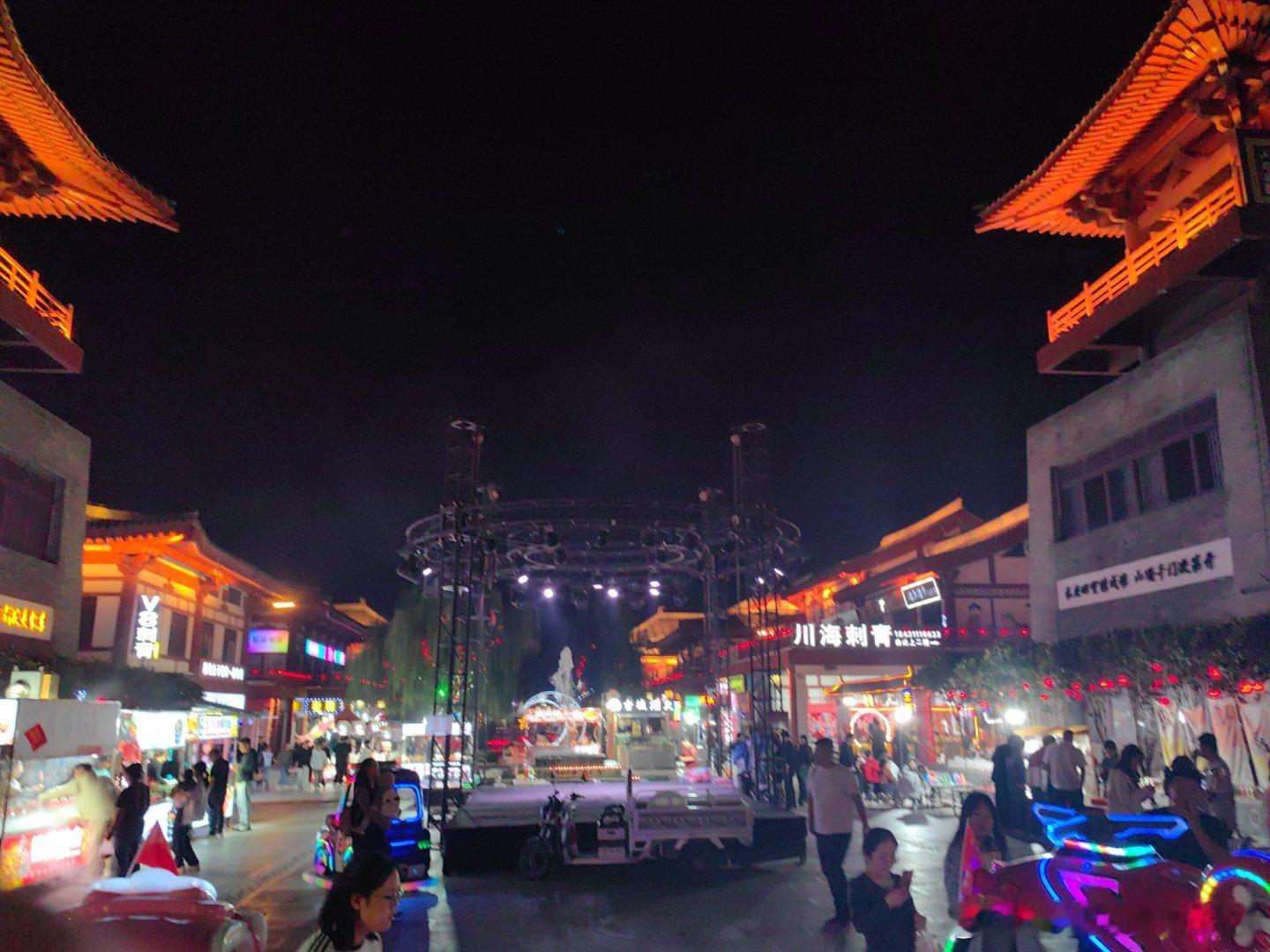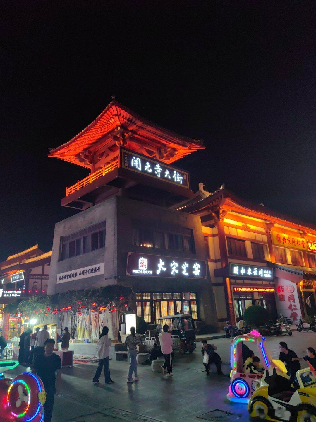 仿唐建筑的飞檐翘角在灯光里流转着古意,市集的喧嚣却又把你拉回热闹的当下。大宋定窑的雅致、精酿鲜啤的畅快,还有各色小吃的香气在空气中交织,连孩童的游乐车都闪烁着斑斓的光。
