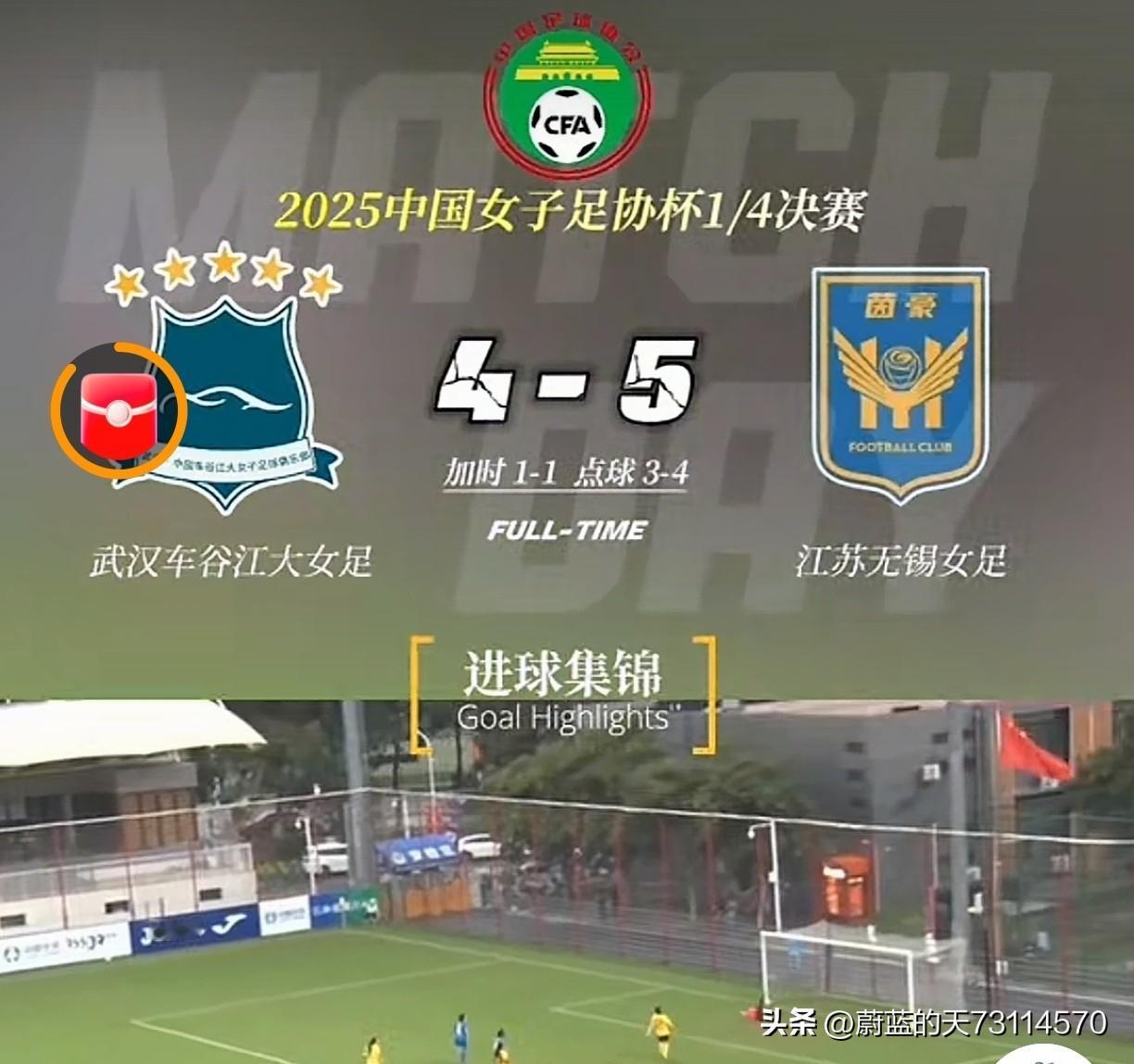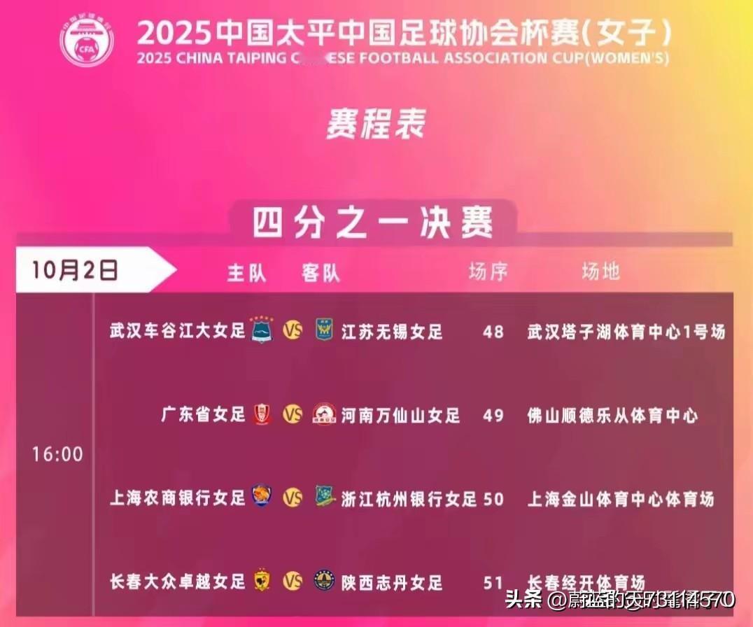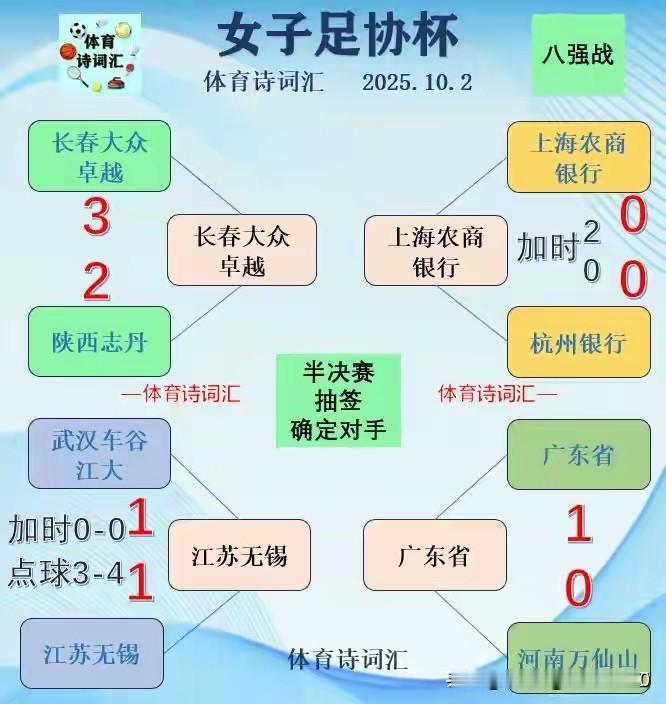 [女超江苏女足获亚军,女足足协杯江苏女足5-4胜武汉,晋级四强] 2024~2025女超刚刚结束,前八名分别是:北京、江苏、辽宁、上海、武汉、山东、长春、广东。 2025年女足足协杯四分之一决赛今开始,战报如下: 江苏vs武汉,常规时间1-1战平,加时战0-0又平, 点球大战:4-3,总比分5-4战胜武汉,晋级四强。 广东vs河南,1-0小胜,晋级四强。 上海vs杭州,常规时间0-0战平,加时赛,上海队2-0获胜,晋级四强。 长春vs陕西,长春以3-2战胜陕西,晋级四強。 [玫瑰][玫瑰]四强半决赛抽签对阵情况: 长春vs上海,江苏vs广东。
