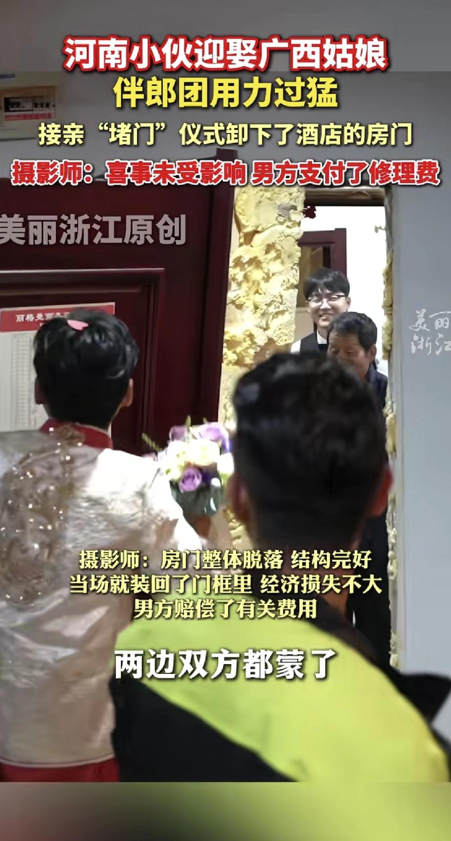 这接亲阵仗也太猛了!河南小伙娶广西姑娘,娘家人比较远,就安排在酒店接亲,伴郎团一激动,直接把酒店房门给卸下来了。两边人都看蒙了——堵门变成拆门,谁见过这场面? 幸好房门结构完好,当场就装回去了。男方也爽快赔了修理费,没影响喜庆气氛。 结婚图个热闹可以理解,但力度还得把握好。这么特别的“开门红”,估计够新人记一辈子了!