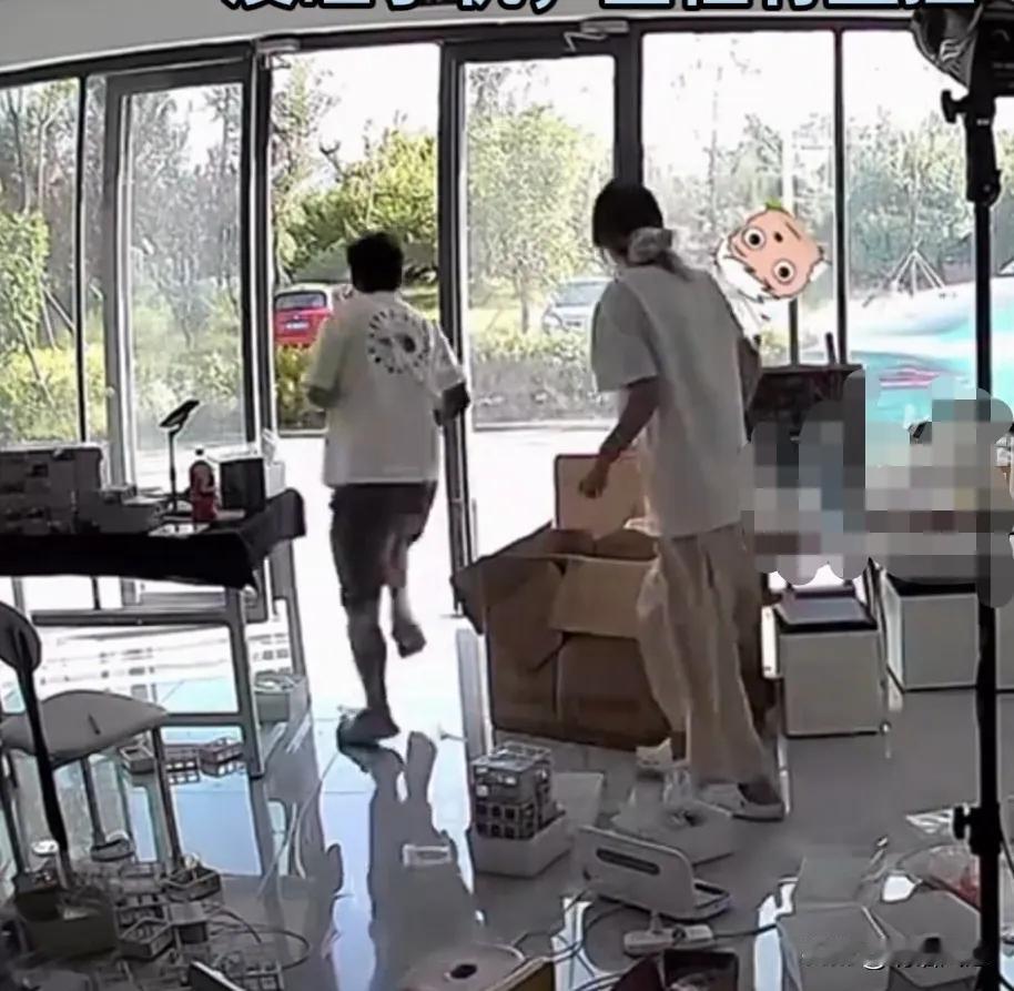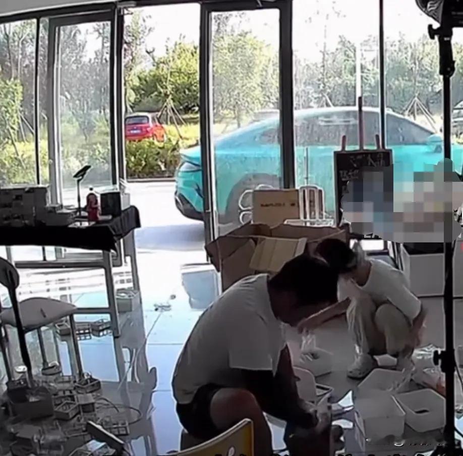 山东威海。 一对夫妻正在店里忙碌着,放在店门口的新能源车竟然自己开走了。男主人赶