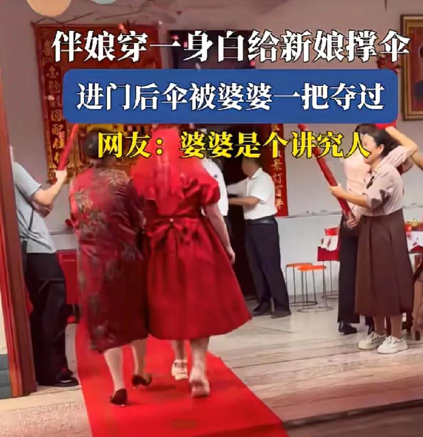 伴娘穿一身白给新娘撑伞 进门后婆婆推开伴娘,一把夺过伞 本想着说婆婆是个讲究人就是处理方式野蛮了,不尊重伴娘 但是镜头一转,这新娘穿搭不大讲究 说是中式婚礼,红盖头盖着 但是衣服又不是中式婚礼的西服 鞋子更是白色松糕底鞋 手上拿着手机,肩上挎着小包包 主打一个随性,结婚跟逛街似的 再说伴娘的礼服大多数都是新娘准备 如果新娘不满意伴娘穿一身白 也不会让她一路跟着 总结:婆婆太讲究,新娘太不讲究 这以后最好不在一起生活