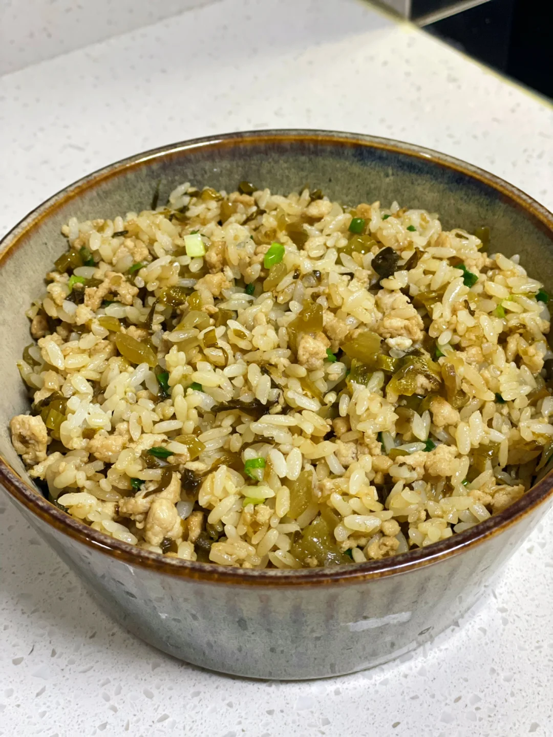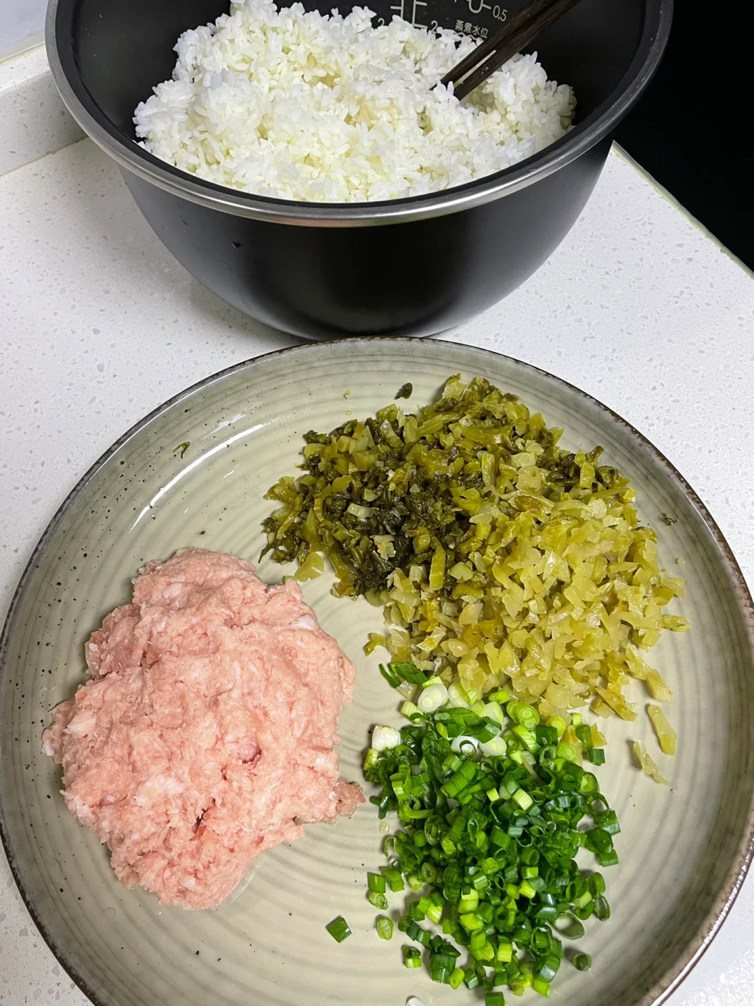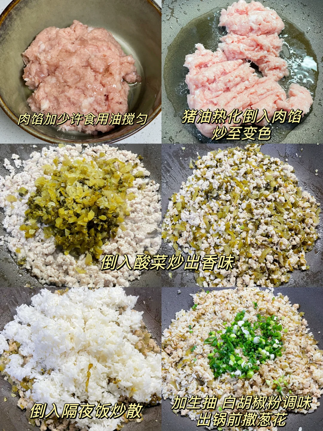 建议大家一定要试试这个炒饭,不爱吃米饭的人都得吃一大碗,称之为炒饭天花板也不为过,巨好吃[派对R] 食材:隔夜米饭 肉末 酸菜 葱花 肉末中加少许食用油搅匀,锅中少许猪油热化了倒入肉末炒至变色,再倒入酸菜炒香,加入隔夜米饭炒散,加入少许白胡椒粉和少许生抽调味,出锅前加葱花炒匀即可