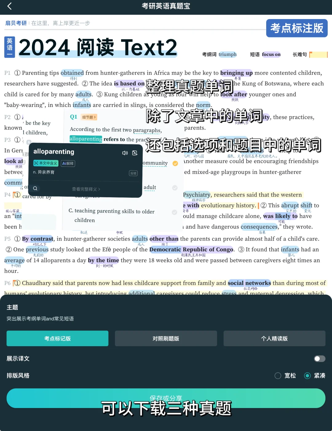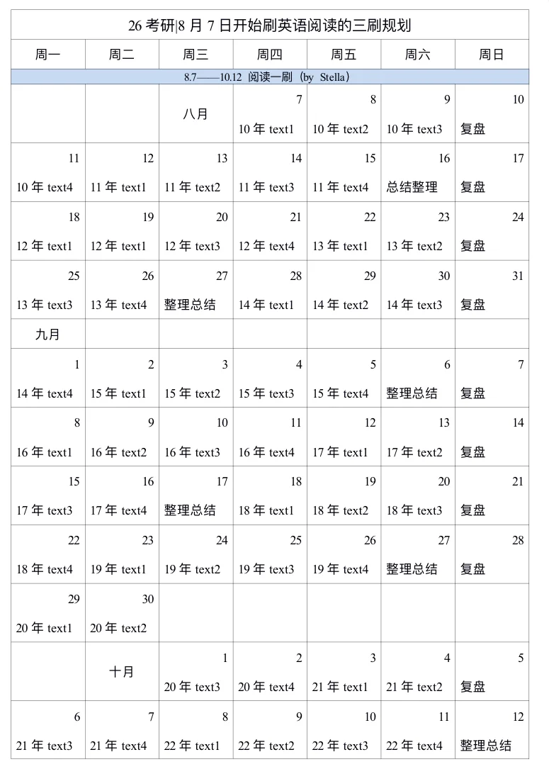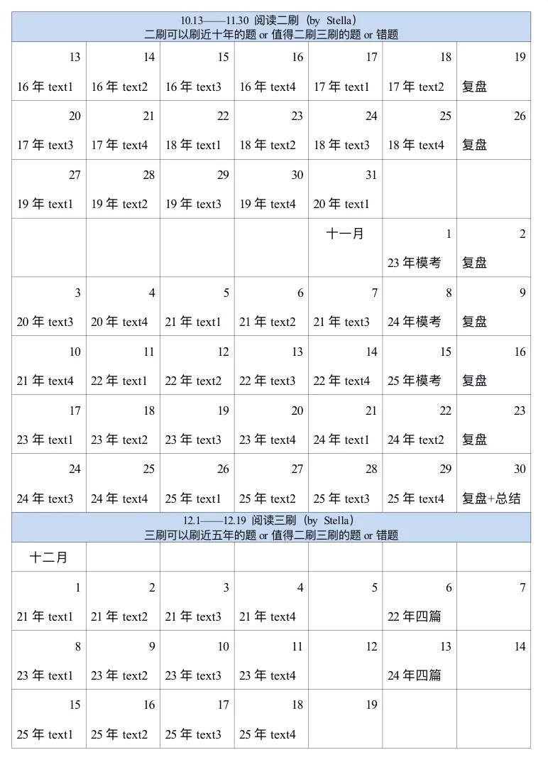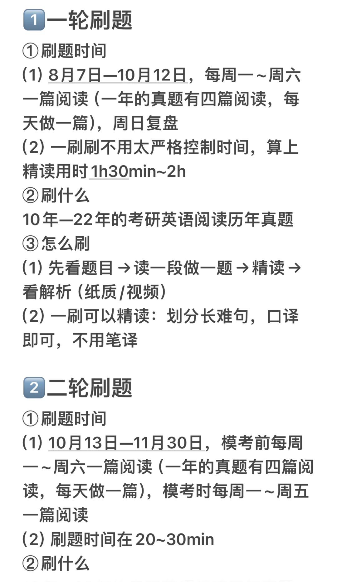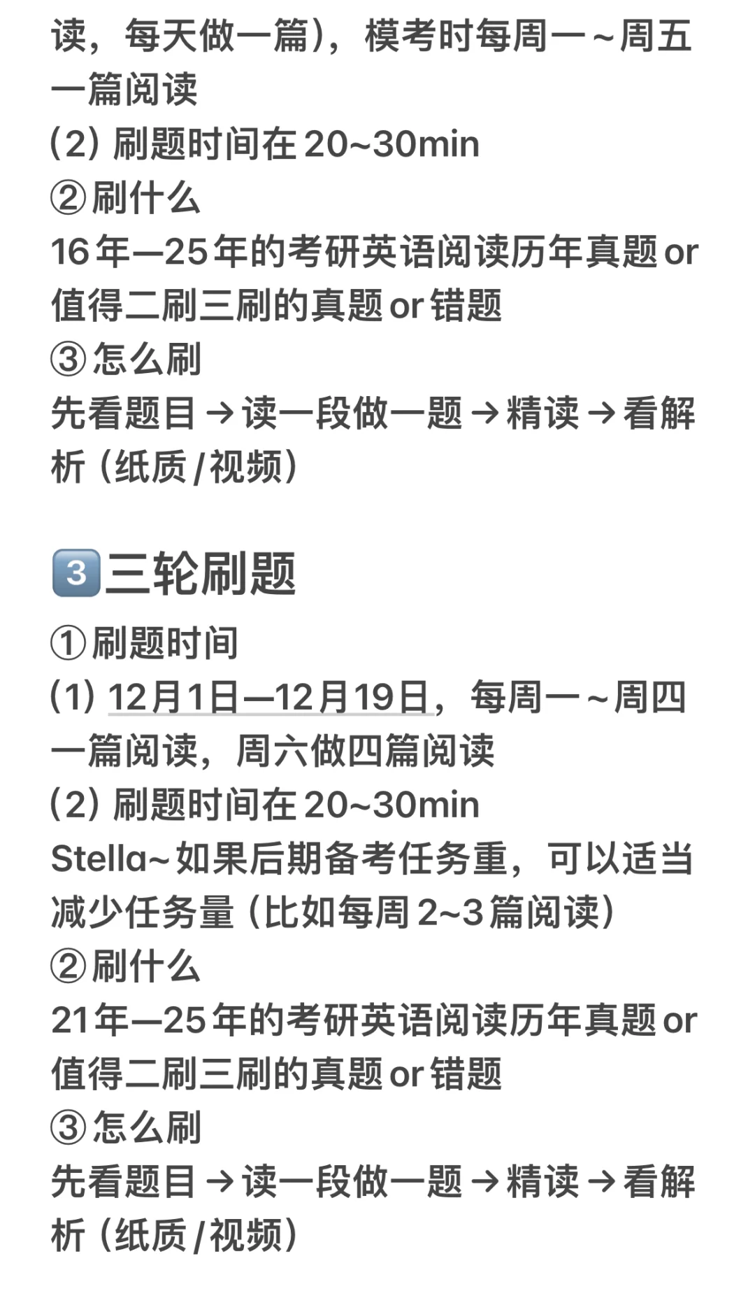 距离26考研还有136天,假如你从8月7日开始做英语阅读题,那么可以刷三轮题↓ 1️⃣一轮刷题 ①刷题时间 (1)8月7日—10月12日,每周一~周六一篇阅读(一年的真题有四篇阅读,每天做一篇),周日复盘 (2)一刷刷不用太严格控制时间,算上精读用时1h30min~2h ②刷什么 10年—22年的考研英语阅读历年真题 ③怎么刷 (1)先看题目→读一段做一题→精读→看解析(纸质/视频) (2)一刷可以精读:划分长难句,口译即可,不用笔译 2️⃣二轮刷题 ①刷题时间 (1)10月13日—11月30日,模考前每周一~周六一篇阅读(一年的真题有四篇阅读,每天做一篇),模考时每周一~周五一篇阅读 (2)刷题时间在20~30min ②刷什么 16年—25年的考研英语阅读历年真题or值得二刷三刷的真题or错题 ③怎么刷 先看题目→读一段做一题→精读→看解析(纸质/视频) 3️⃣三轮刷题 ①刷题时间 (1)12月1日—12月19日,每周一~周四一篇阅读,周六做四篇阅读 (2)刷题时间在20~30min Stella~如果后期备考任务重,可以适当减少任务量(比如每周2~3篇阅读) ②刷什么 21年—25年的考研英语阅读历年真题or值得二刷三刷的真题or错题 ③怎么刷 先看题目→读一段做一题→精读→看解析(纸质/视频)
