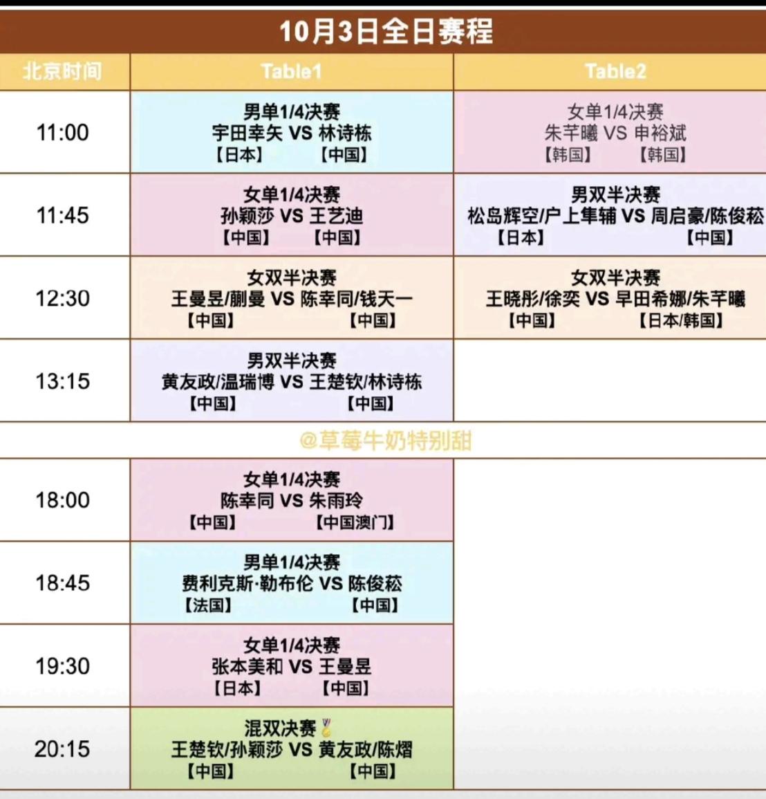 加油中国金花![点亮平安灯][点亮平安灯][点亮平安灯] 今天女单孙颖莎VS王艺迪,希望她们拼尽全力,打出最精彩的比赛,无论谁赢,都是中国的骄傲! 王曼昱VS张本美和,这不仅是技术的较量,更是中日乒乓的又一次对决!王曼昱必胜! 陈幸同VS 朱雨玲,虽然朱雨玲经验丰富,但同同要稳扎稳打,别给对手任何机会! 中国四朵金花加油!你们都是中国的骄傲!