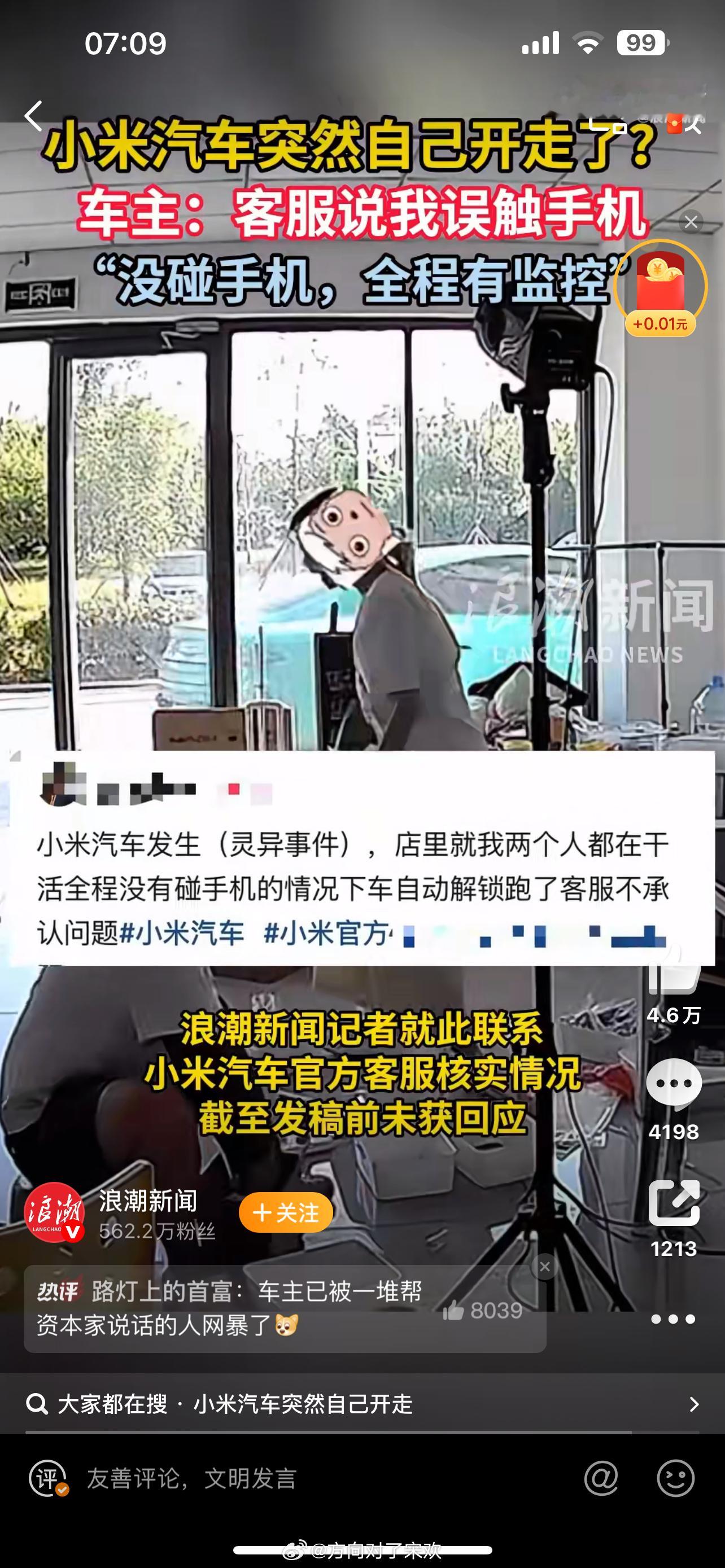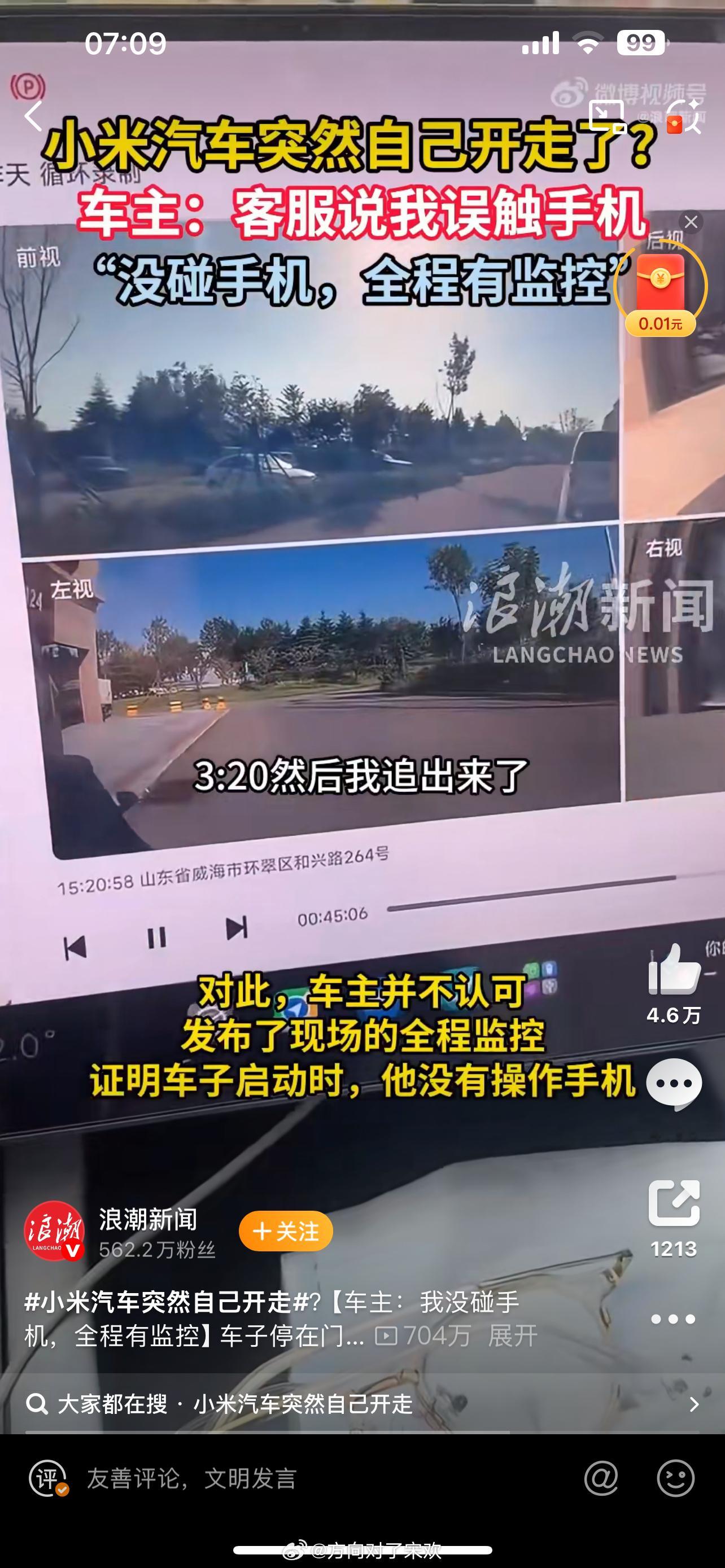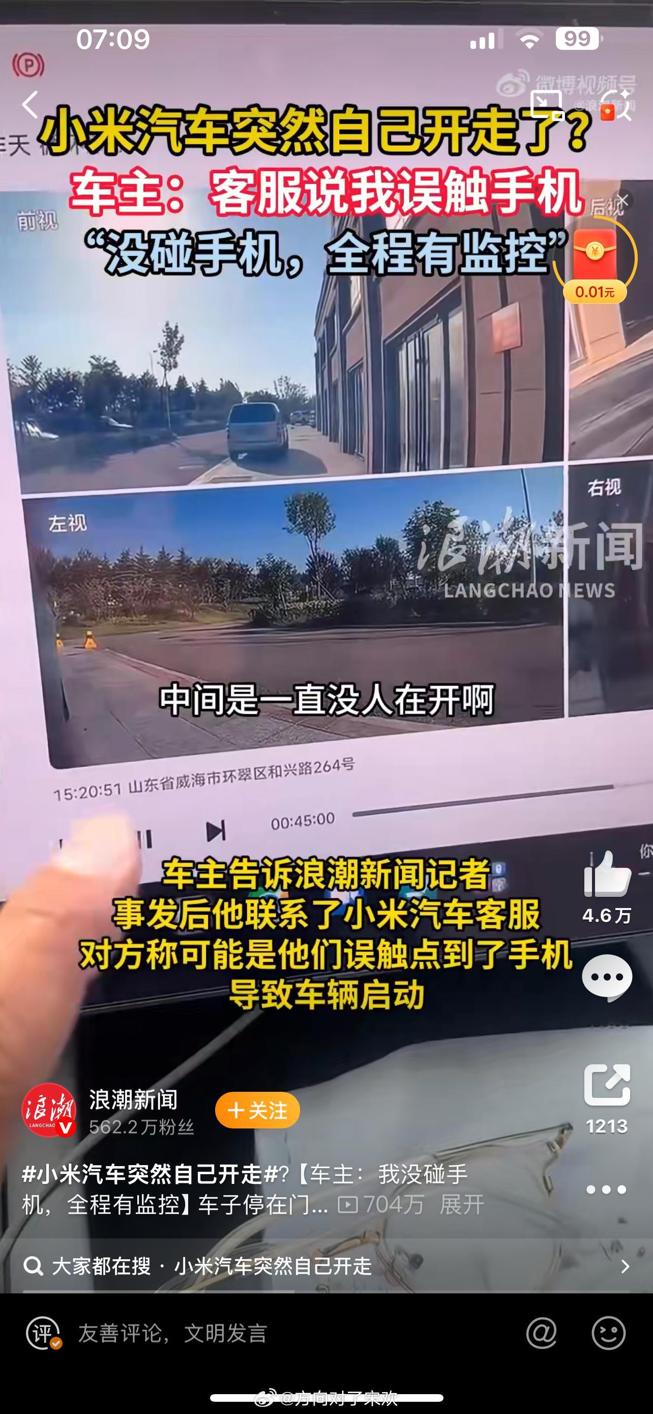 据浪潮新闻报道,9月30日,山东威海一位小米车主发视频反映自己的遭遇,自称小米汽车突然自己开走?要求厂商给出解释。车主告诉浪潮新闻记者,事发后他联系了小米汽车客服,对方称可能是他误触点到了手机导致车辆启动。对此,车主并不认可,发布了现场的全程监控,证明车子启动时,他没有操作手机。车主还称“小米汽车发生(灵异事件),店里就我两个人都在干活全程没有碰手机的情况下车自动解锁跑了客服不承认问题”。大v聊车小米汽车小米自己开走小米汽车[超话]