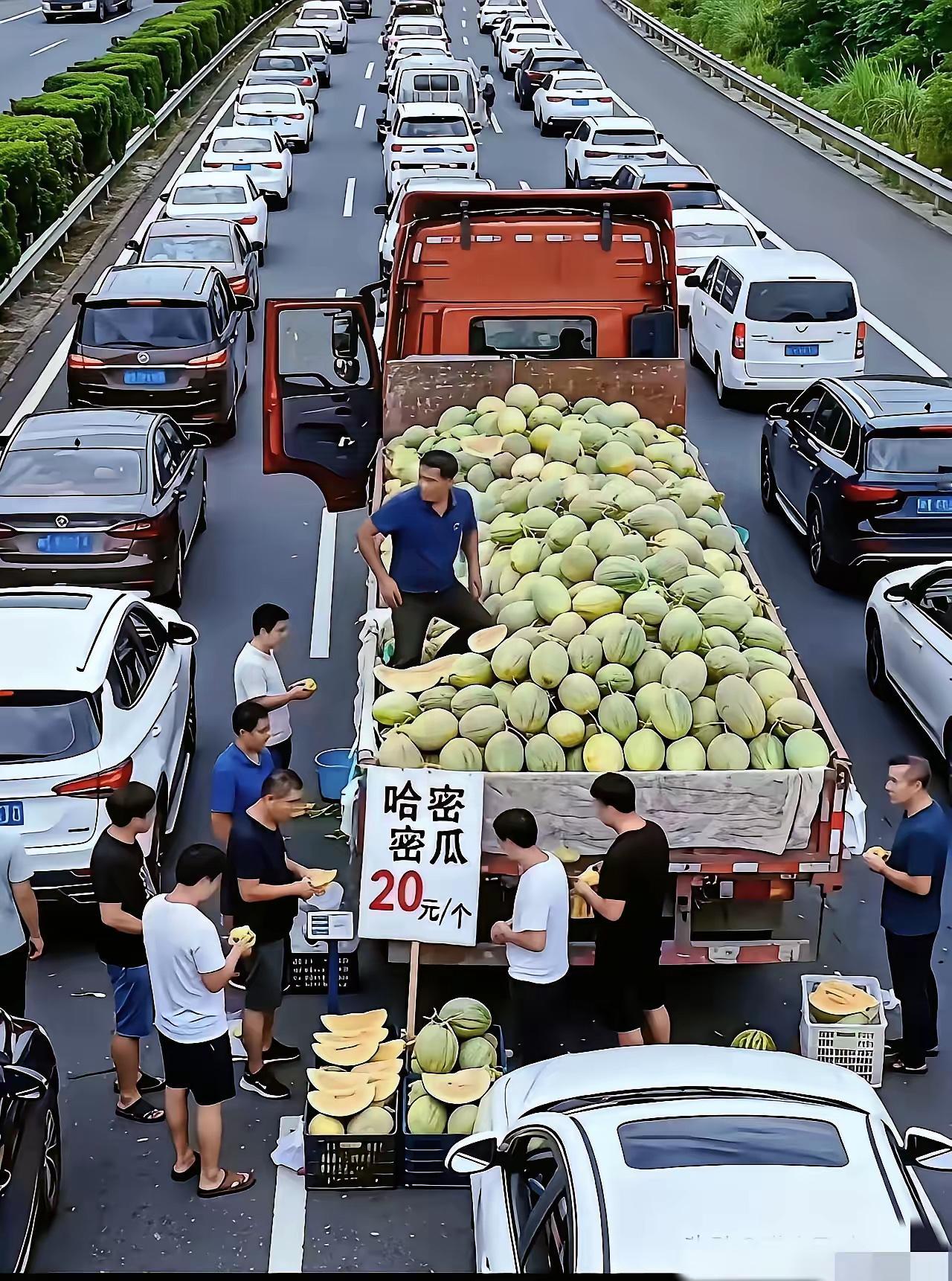 长假高速堵成长龙, 一位大哥拉着满车哈密瓜赶路, 没想到还没到目的地, 瓜就被抢空,真不是特意来高速卖瓜的! 这根本是“意外商机”撞上了刚需。堵在路上又渴又烦,新鲜哈密瓜正好戳中了大家的需求,就像有司机在服务区卖瓜,40分钟都能入账1800元。 大哥这波操作,是把突发状况变成了减少损失的办法,毕竟水果放久了容易坏,就地售卖既能保新鲜,还能解路人的急。 但夸归夸,得说句实在的:要是占应急车道卖货可就错了,那不仅违法,还藏着大安全隐患。大家买得开心,前提得是在不影响交通的地方交易。 你堵在路上遇见过这种“意外惊喜”吗?要是碰到了会买吗?来聊聊~