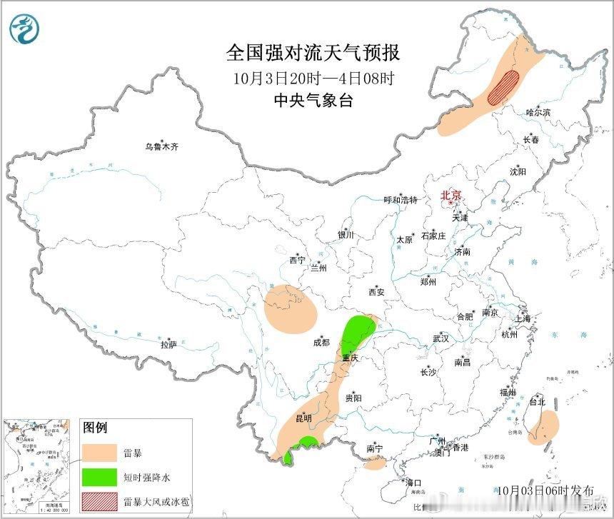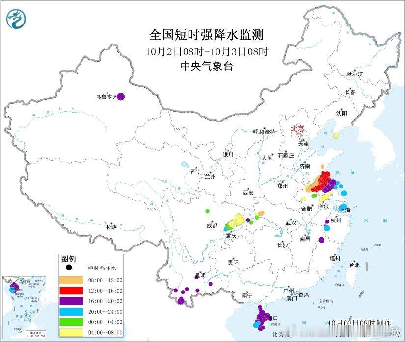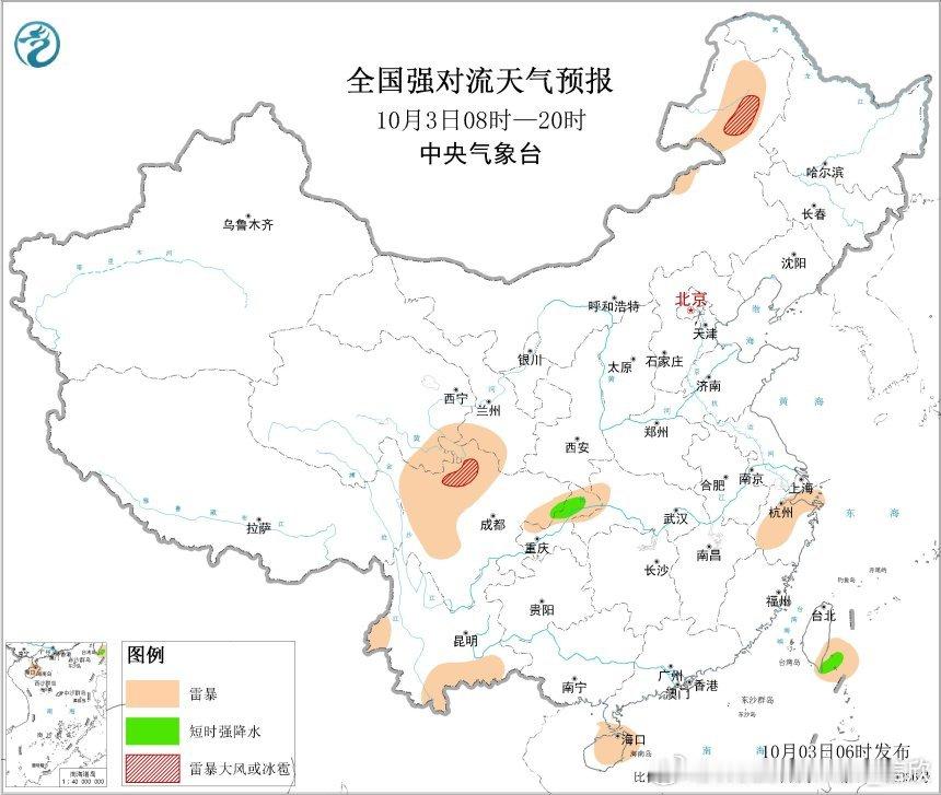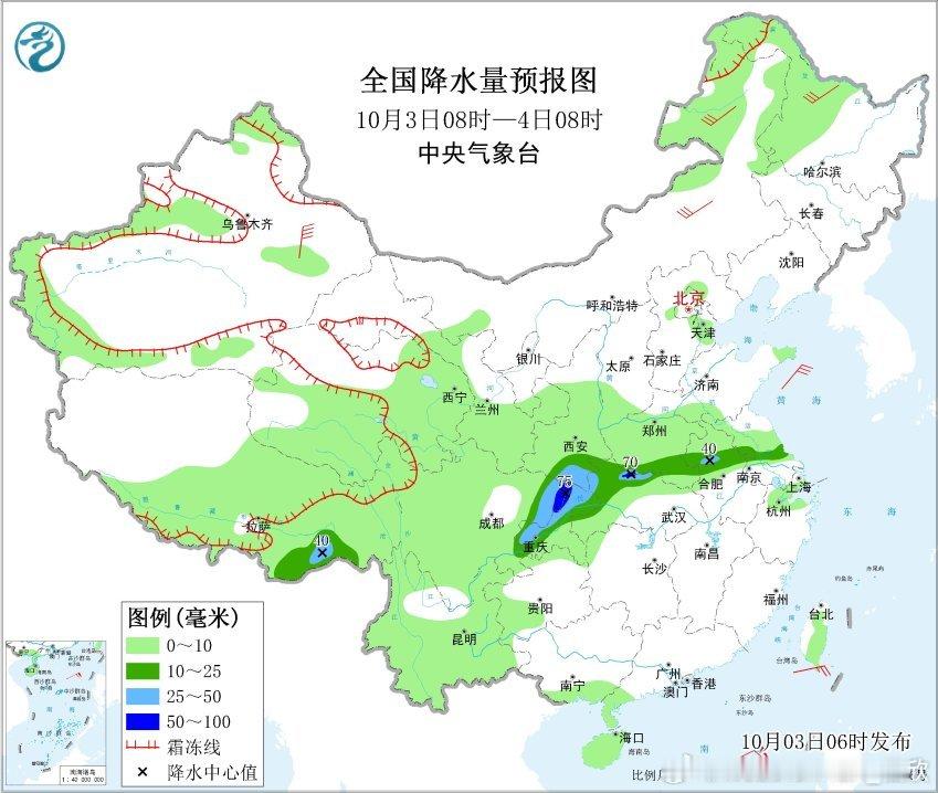 预计10月3日08时至4日08时,四川东部、西藏东南部、重庆北部和西部、湖北北部、陕西南部、河南南部、安徽中部、江苏西部等地的部分地区有中到大雨,其中,四川东北部、重庆东北部、湖北北部等地的部分地区有暴雨(50~75毫米)。四川重庆云南内蒙古部分地区可能伴随短时强降雨或雷雨大风等强对流天气。