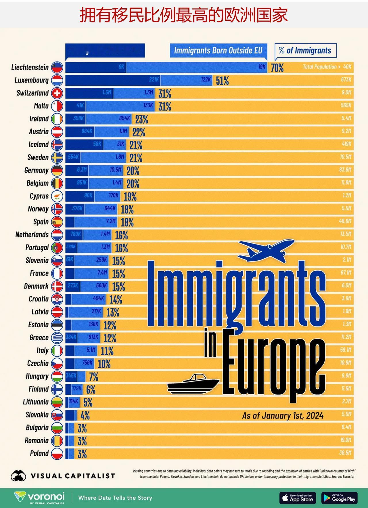 移民比例最高的欧洲国家是哪些? 下面信息图表按照移民比例对 31 个欧洲国家进行了排名,并列出了这些国家人口总数以提供更全面的背景信息。 此图表所使用的数据来自欧盟统计局,该机构根据 2024 年 1 月 1 日的出生地情况统计了各国家的常住人口数量。 ——移民比例最高的欧洲国家 列支敦士登的外国出生人口占比高达 70%,这一比例颇为突出,但卢森堡(51%)和马耳他(31%)也严重依赖移民。 它们拥有规模较小的本土劳动力队伍、有利的税收政策以及跨境就业市场,这些因素形成了强大的吸引力。在这三个地区中,非欧盟移民占多数,这凸显了它们作为全球(而非仅仅欧洲)人才聚集地的地位。 ——德国是欧洲移民最多的国家 德国就自身而言,移民人数达 1690 万,占欧盟所有外国出生居民总数的四分之一。 其人口老龄化以及强大的制造业基础使得对劳动力的需求保持稳定。 然而,这些入境者中仅有 37% 来自欧盟内部,这表明德国的吸引力远远超出了欧洲大陆范围,而且还体现了更广泛的地缘政治吸引力,包括来自中东和亚洲的移民潮。 ——欧洲的东西人口迁移模式 西欧和北欧地区的移民比例平均在 15%以上,而许多东欧国家的这一比例则低于 5%。 波兰(3%)和罗马尼亚(3%)排在最后两位。 这反映了东西方的迁徙路线。 尽管经济一体化使得欧洲东西部之间的工资差距有所缩小,但西方的就业市场和较高的生活水平仍吸引着东欧人前来,这导致欧盟内部出现了明显的人口结构失衡现象。 ——该数据中包含了哪些类型的移民? 大多数欧盟成员国都依靠行政数据向欧盟进行报告,例如人口登记、外国人登记、居住登记、工作许可、医疗保险登记或税务登记等。 因此,这些数据不包括那些非法入境的移民,以及那些以非政府机构所能统计的方式居住的移民。 此外,除了上述列出的四个国家(波兰、斯洛伐克、瑞典和列支敦士登)之外,其他所有国家都将乌克兰人纳入了临时居留或难民许可的统计范畴内。 移民必须在该国居住超过 12 个月才能被计入统计范围。