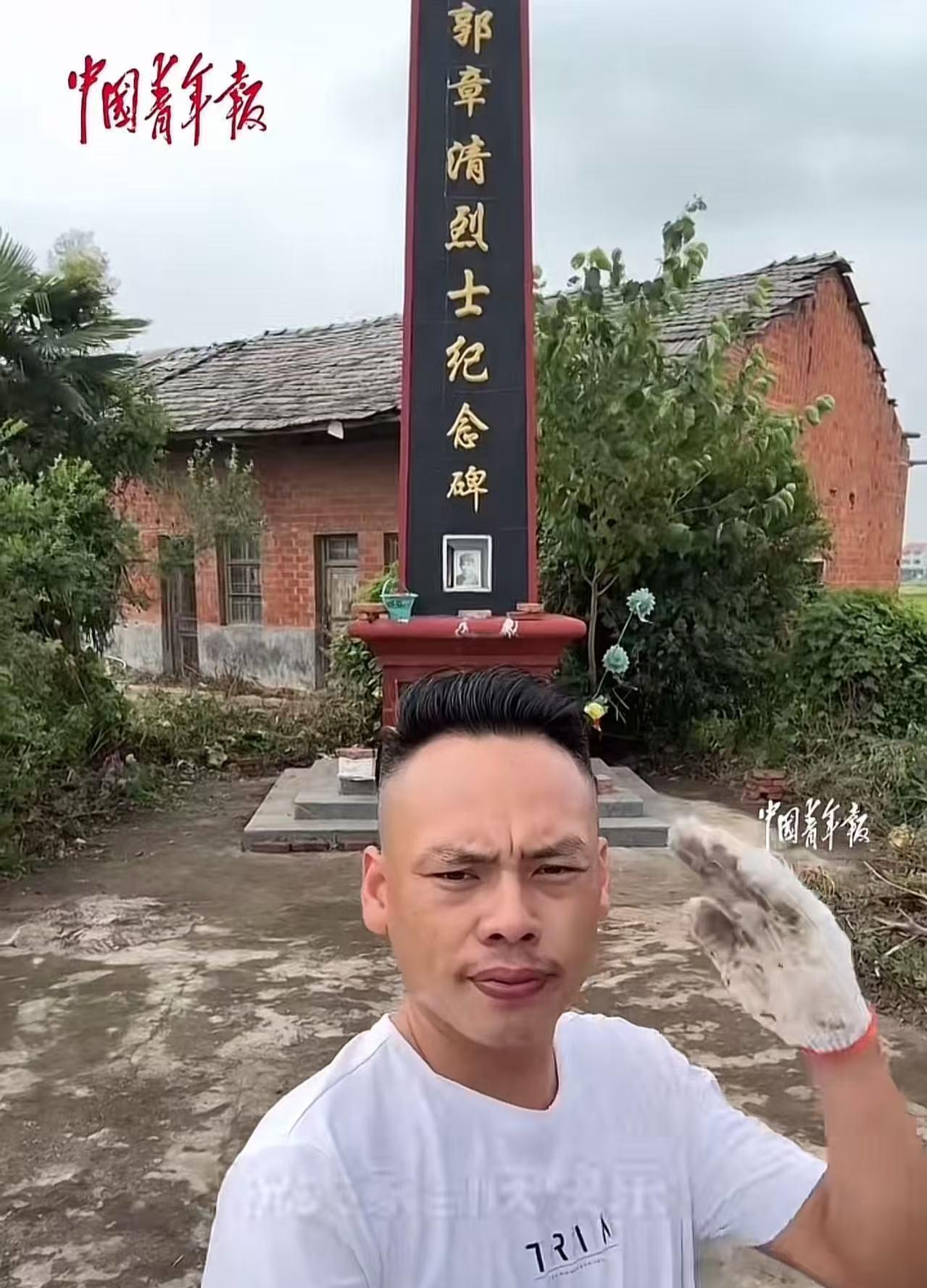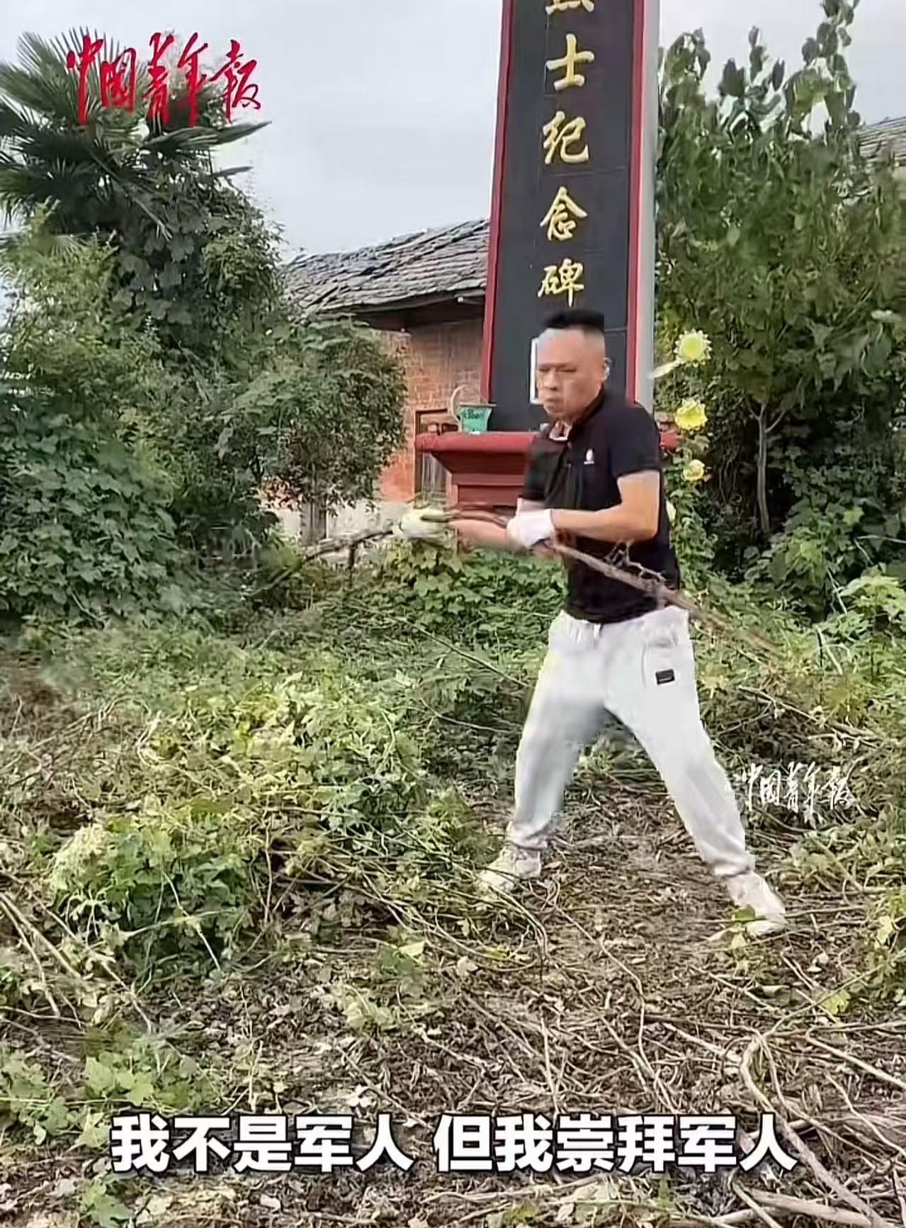 “这个大哥火到青年报!”湖北荆州,男子出差途中见一座烈士纪念碑前长满杂草,主动上前清理!男子:我不是军人,但我崇拜军人,缅怀先烈,铭记历史! 网友:很感动,但这个村的一把手应该检讨一下! 男子出差途中路过这座纪念碑,而纪念碑前的景象让他心头一紧。只见周围杂草丛生,将原本整洁的地面侵占得凌乱不堪。 那一刻,男子的心中五味杂陈,有对眼前破败景象的惋惜,更有一种难以言喻的沉重。 他的思绪不由自主地飘回到了那个战火纷飞的年代,眼前仿佛浮现出先烈们浴血奋战的壮烈场景。 他们身着破旧的军装,在枪林弹雨中奋勇前行,不惜抛头颅、洒热血。那一个个鲜活的身影,那一声声激昂的呐喊,仿佛穿越了时空,在他耳边回荡。 男子觉得,必须要缅怀先烈,铭记历史,把纪念碑打扫干净。 但他并未携带清理工具,想要立刻动手清理这片杂草丛生的区域,也是心有余而力不足。 无奈之下,他只能带着满心的遗憾和不舍,继续踏上了出差的路途。 但那份对先烈的敬仰之情,如同种子一般,在他的心中生根发芽,愈发强烈。 第二天,忙完手头工作的他,一刻也没有耽搁,立刻去备齐了清理工具。他开着车再次回到了纪念碑前。 他拿起工具,开始动手清理杂草。他一会儿弯腰拔草,一会儿挥动铲子铲除顽固的草根。 那原本洁白的裤子,被泥土染成了黑色,裤脚上还沾满了草屑和灰尘,可他却毫不在意,仿佛这些外在的污渍根本无法影响他内心的虔诚与敬意。 随着他一下又一下的努力,杂草被一点点地清理到路边,原本被杂草掩盖的地面逐渐露了出来,纪念碑周围也渐渐恢复了往日的整洁与庄严。 这本不是男子的份内之事,他没有义务一定要这样做,可出于对先烈的深深敬仰,他主动承担起了这份责任,做了自己力所能及的事情。 最后,他站直了身子,整理好自己的衣衫,恭恭敬敬地向先烈们敬了一个标准的礼。 此事引发热议,有网友说,村委的工作到底包括什么呀?没有恶意,只是想问问?一个村最该保护的都变得杂草丛生…… 也有网友说,昨天我拿了两箱月饼带儿子去了陵园,回来儿子说:妈,我以后一定要去当兵保卫国家保护你…… 还有网友说,章清村,竟然是以烈士名字命名的村庄,看杂草丛生荒芜的烈士纪念碑,有何感想? 很多人都在忙碌地追求着功名利禄,却常常忽略了那些为我们默默付出、奉献一切的英雄们,尤其是当地的村干部。 而这位男子的行为,就像一束光,照亮了我们内心深处对英雄的敬仰与感恩之情。他用实际行动诠释了什么是真正的敬意,什么是对历史的尊重。 他让我们明白,英雄从未远去,他们的精神永远熠熠生辉,只要我们心中有敬,有爱,就能让这份精神代代相传,永不磨灭!