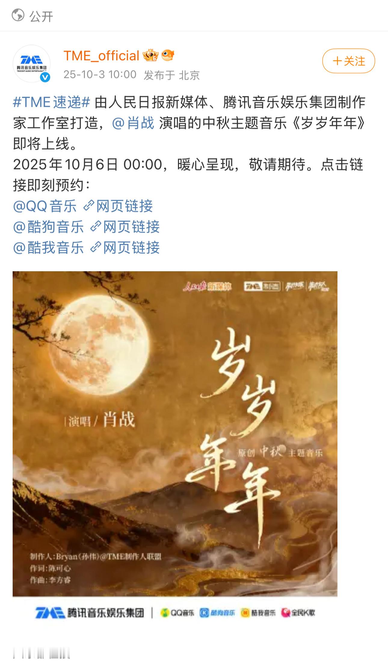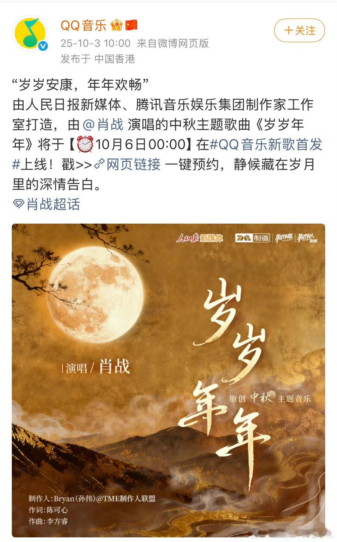 哇,由人民日报新媒体、腾讯音乐娱乐集团制作家工作室打造,唱的中秋主题歌曲《岁岁年年》10月6日00:00上线!!! 惊喜!!