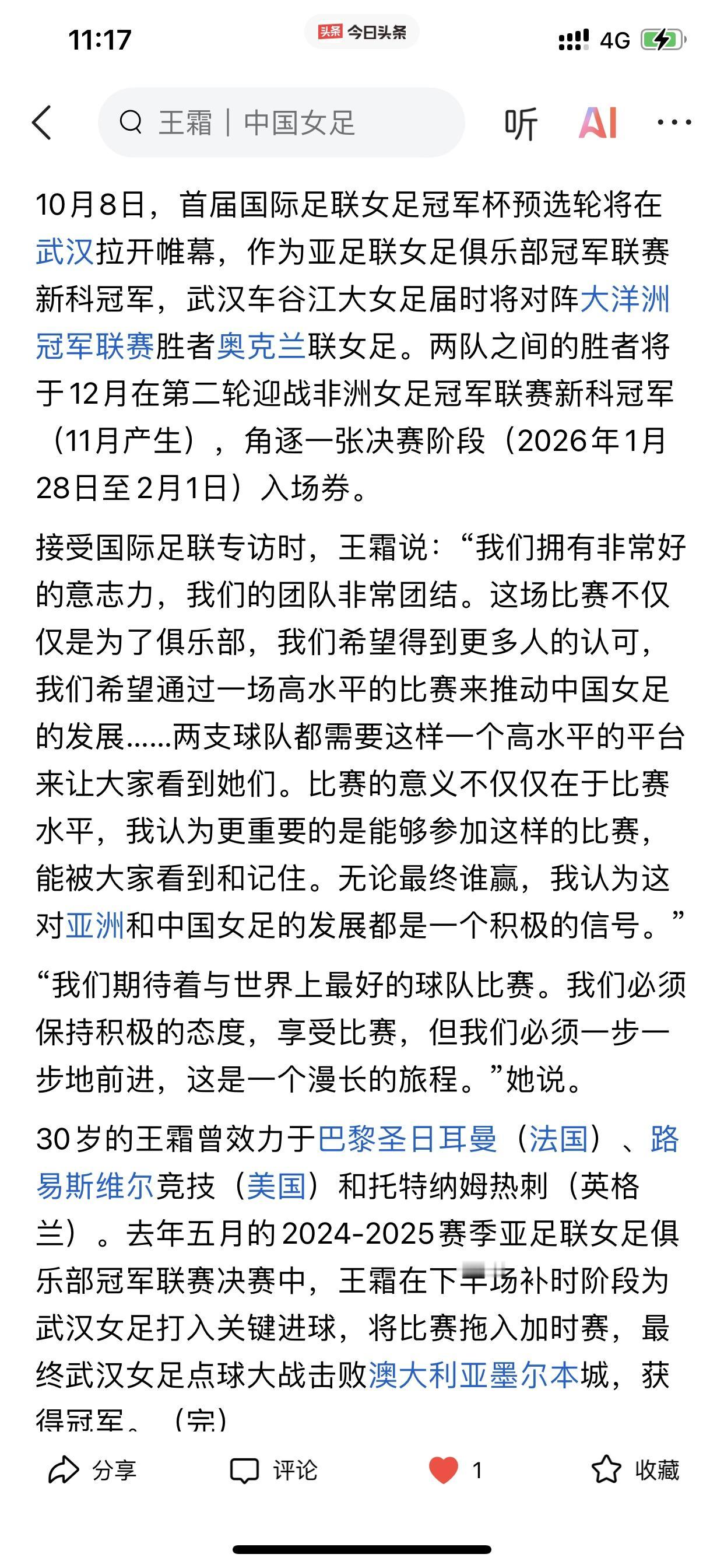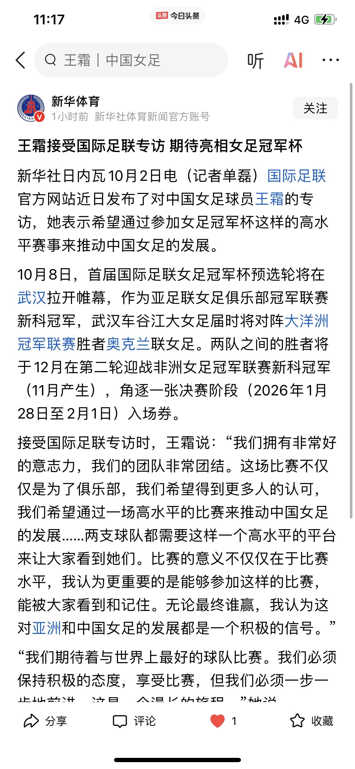 王霜接受国际足联的专访! 不得不说,哪怕我在曾在网上说王霜已雄风不再,可她依旧是中国女足现役最耀眼的那颗星。 我前几天还说王霜入围亚足联的最佳女足球员的候选,更多是考虑名气和影响力,而不是以球员的个人战绩作为第一标准,可这个依旧阻挡不了国际足联对武汉车谷江大女足做采访时,专访球员首选王霜! 好了,我是2017年才开始关注王霜的,那时对她只有喜欢和热爱,在网上也不希望看到一丝否定王霜的言论! 但时至今日,我自己也开始逐渐的要去否定王霜了,可能是看着自己喜爱的人没有以前那么厉害了,所以产生了奇怪的心理,当然这也不妨碍我依旧喜欢看王霜踢球。(所以我一直给我自己定义仅仅是一个观众,连伪球迷都不算) 但不管怎样,在此,我衷心祝愿王霜和她所在的中国武汉车谷江大女足,于10月8日,即将开打的首届国际足联女足冠军杯预选赛上,能够击败大洋洲的奥克兰联女足。 加油,王霜! 必胜,武汉女足!