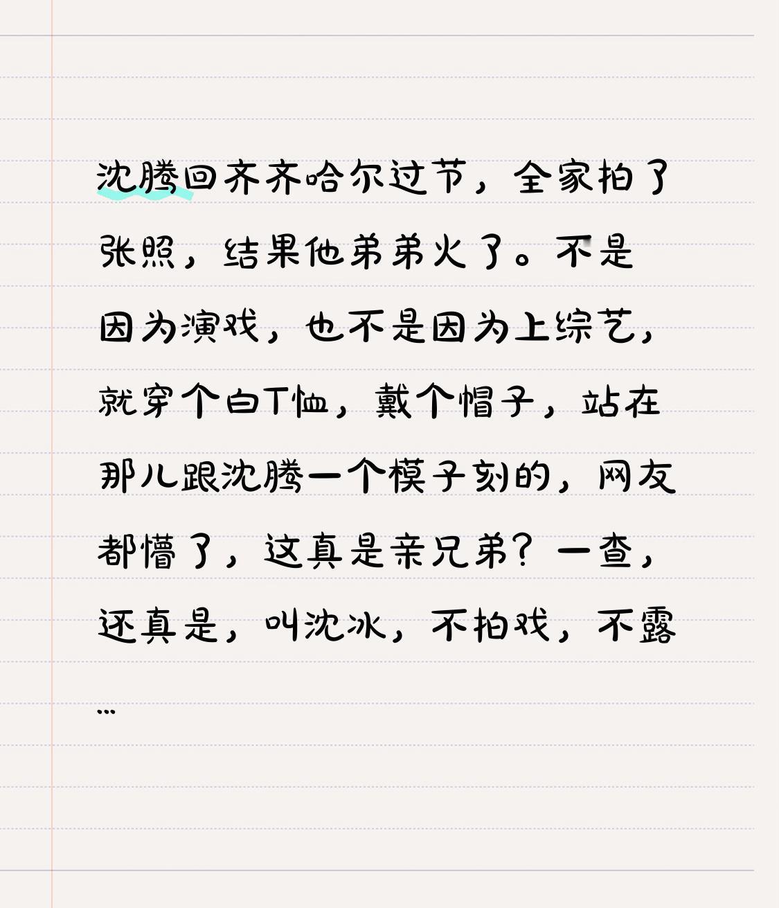沈腾回齐齐哈尔过节,全家拍了张合照,没想到他弟弟意外火了。 他弟弟火并非凭借演戏
