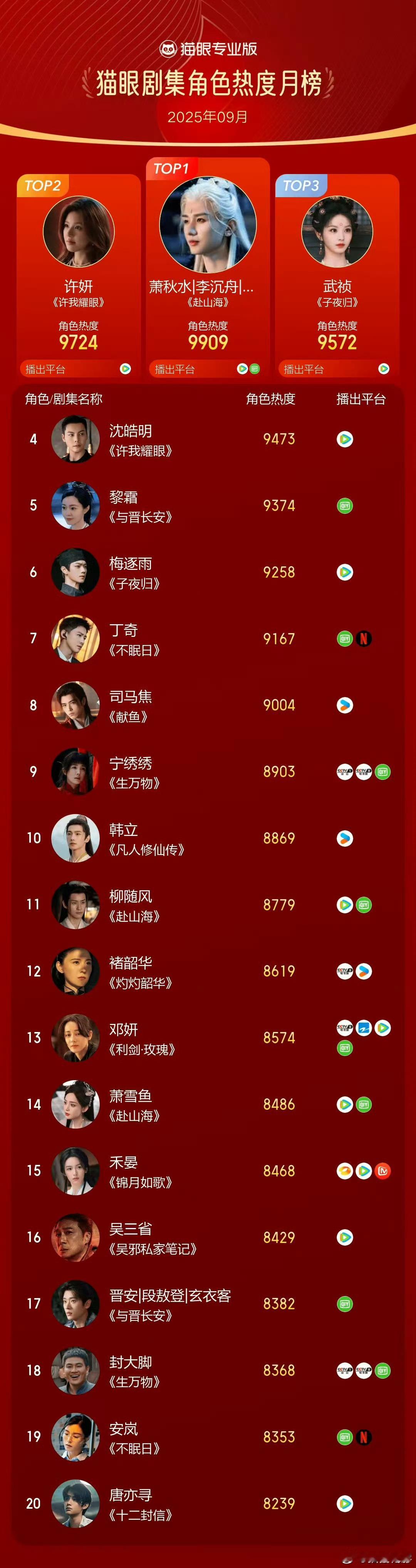 猫眼9月热度最高角色成毅《赴山海》萧秋水|李沉舟|肖明明 ​​​