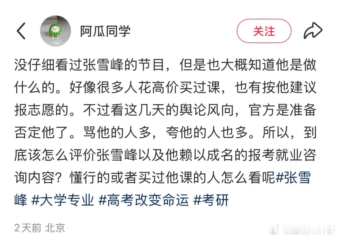 很多网友对张雪峰提出质疑了。张雪峰没出事的时候,大家都把张雪峰当做人生导师。现在