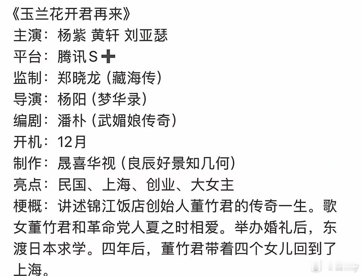 10月2日,杨紫下部剧开机时间已定,《玉兰花开君再来》