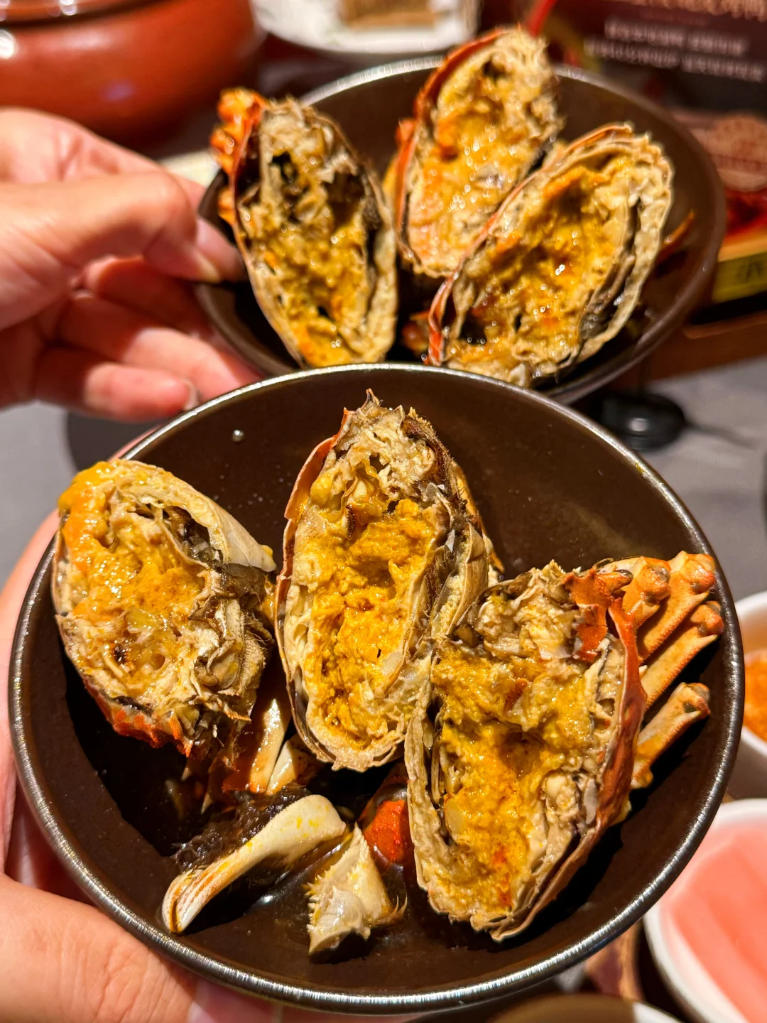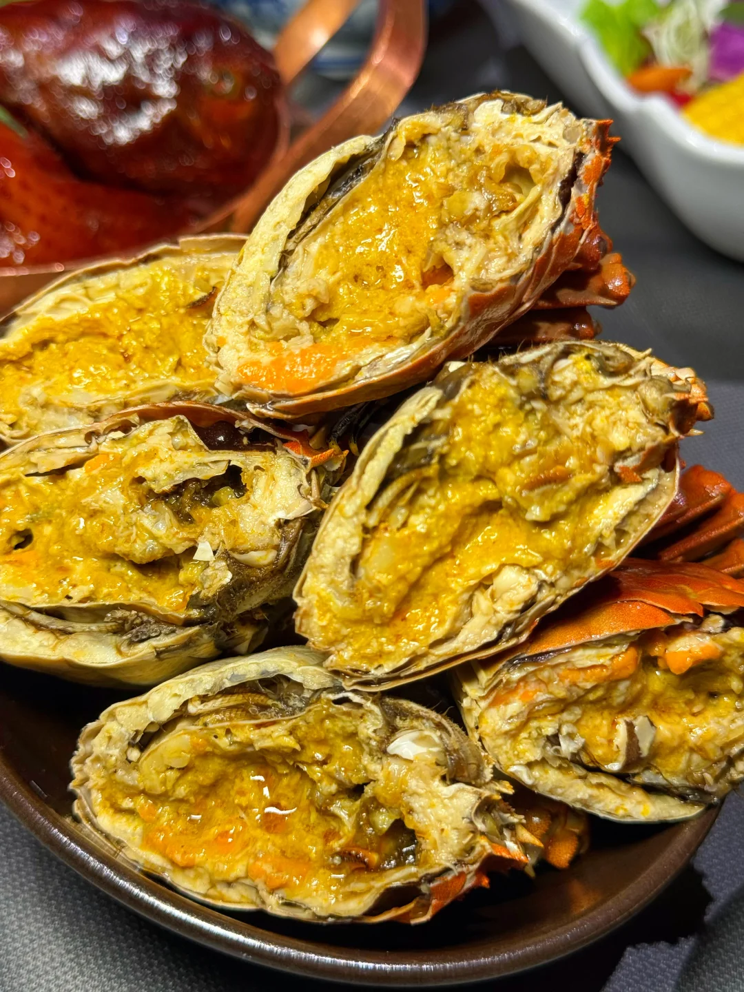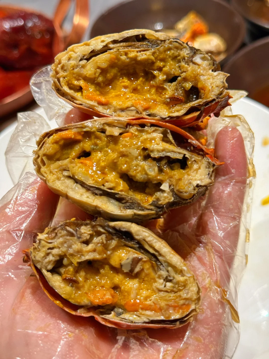 掰开满是流心蟹黄,如果冰镇后口感绵密像冰淇淋,蟹肉吸满酒香,甜咸交织超入味,连蟹壳都想嗦干净!巨巨巨还吃~