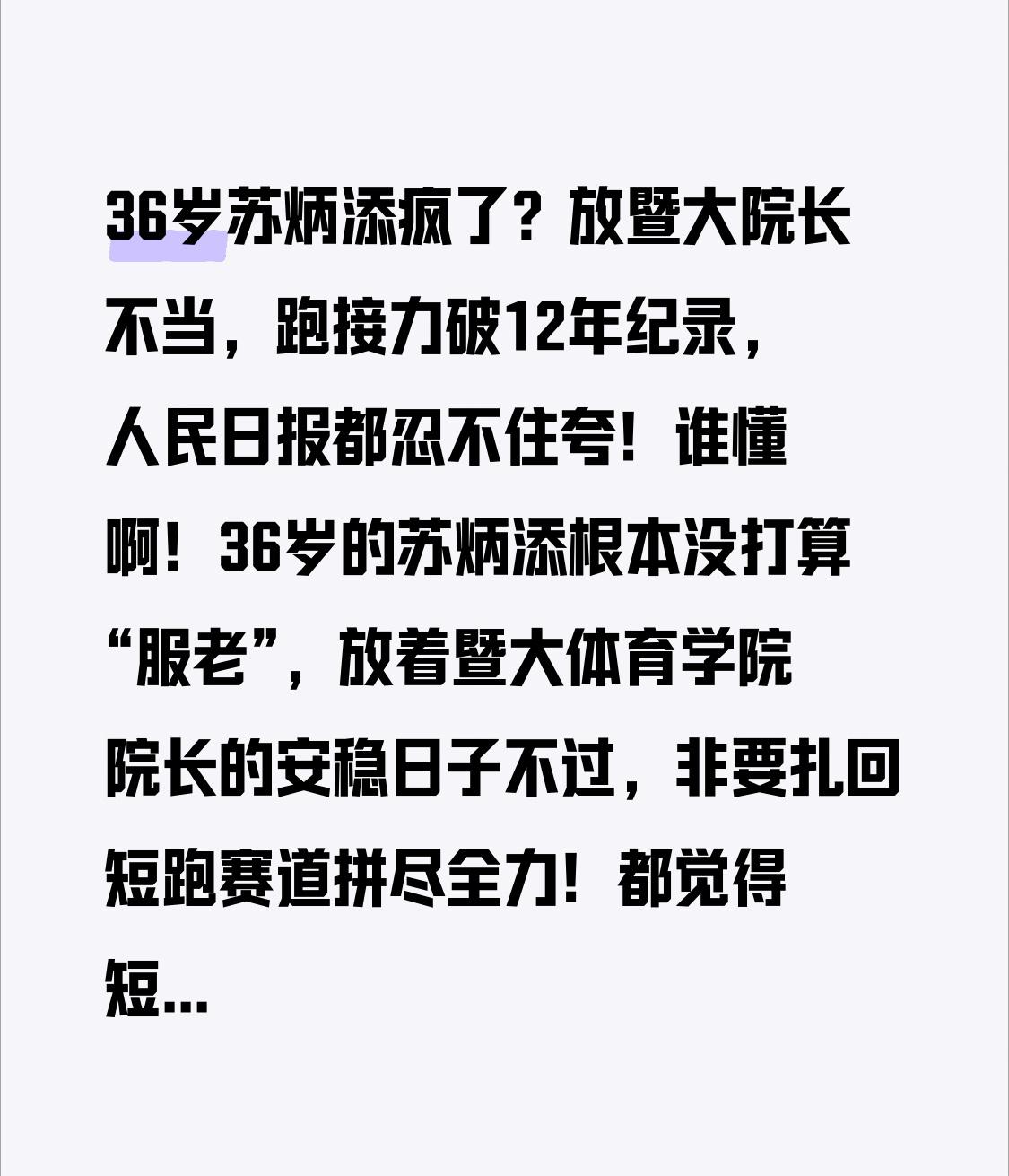 36岁的苏炳添疯了?放着暨大院长不做,跑接力破12年纪录,连人民日报都忍不住称赞! 谁能懂啊!36岁的苏炳添压根没打算“服老”,放着暨大体育学院院长的安稳生活不过,非要一头扎进短跑赛道,拼尽全力! 大家都认为短跑是20岁出头年轻人的主场,36岁早该退居幕后了,可他偏偏要打破这份“理所当然”。在4×100米接力赛中,他站在最累的第一棒位置,还带着广东队打破了自己12年前创下的省纪录! 这哪里是一场普通的比赛,分明是用行动撕掉了“年龄=极限”的标签,人民日报都专门点名表扬他。比起金牌,这份不服输的劲头,才是体育最动人之处。 你们说,苏炳添这种“越老越能拼”的状态,是不是比任何成绩都更吸粉? 苏炳添育儿经 苏斌添