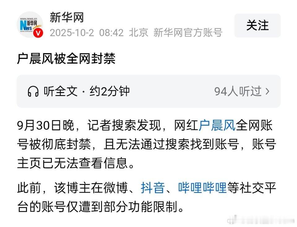 🔻新华网:户晨风被全网封禁。