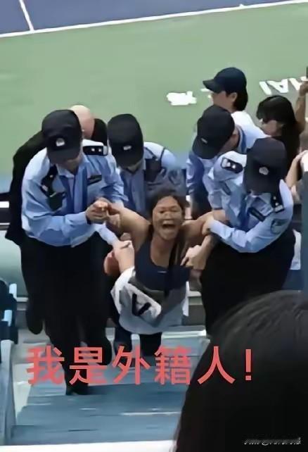明明是中国人,嫁给了老外,整了一本护照,就牛的不成样子,把自己当成了高贵的外籍人士,也许是有点糟钱,看网球大喊大叫,不遵守球场的规矩,连裁判都看不下去了,当维护秩序的人劝阻她的时候,一会儿飙英语,一会儿说汉语,一会儿又是尖叫,真是太丢人了,在国外呆了几天,实际上还是在国内居住,只不过是嫁给了一个老外,就觉得自己高人一等,40多岁的人,算是白活了!