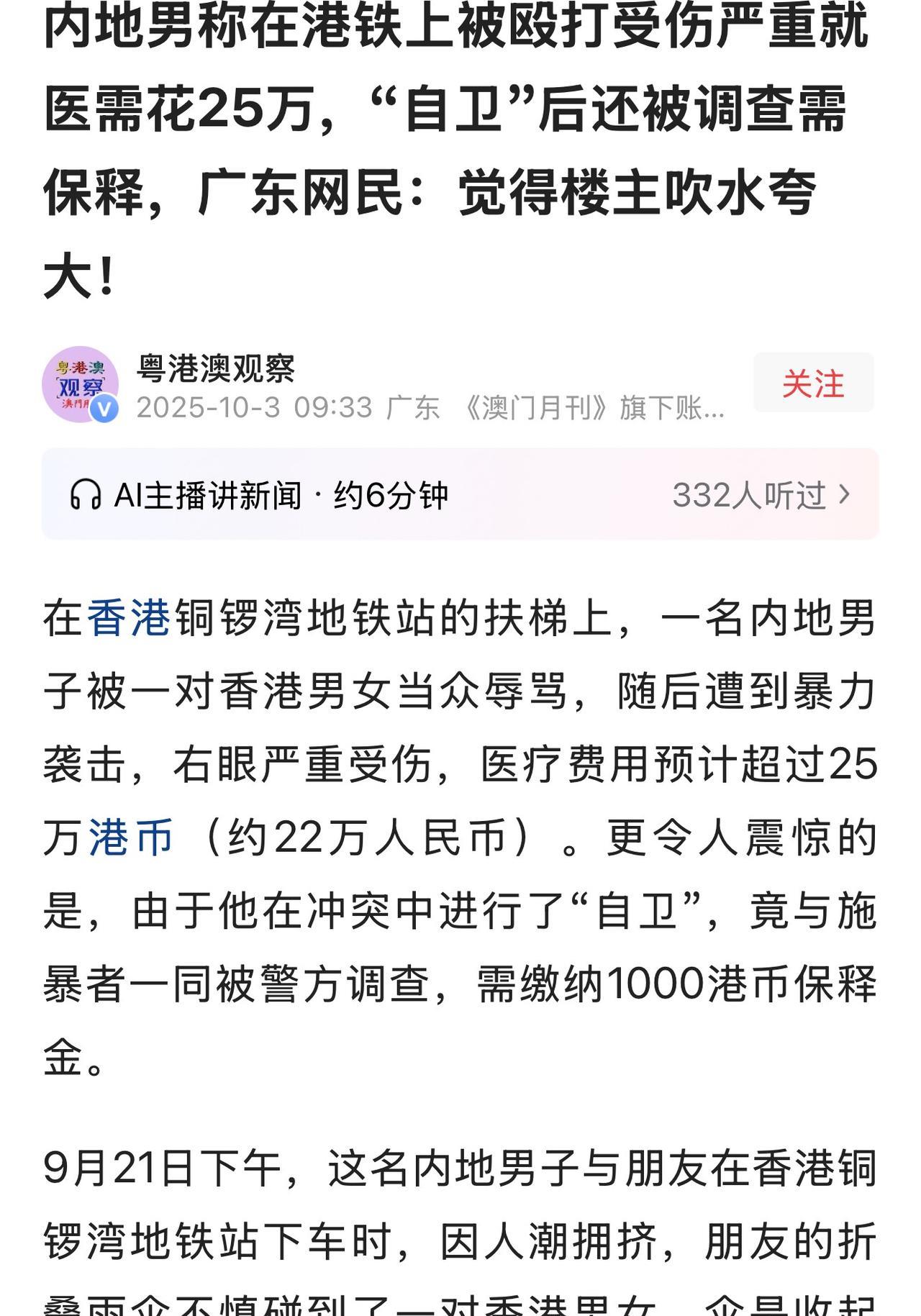 香港铜锣湾,一男子和朋友在地铁站出来,手里的雨伞不小心碰到了一对男女。他们先用粤语低声议论,然后用“北方佬”“大陆人滚回去”等地域歧视性语言辱男子,甚至连男子的家人也问候个遍。男子忍无可忍,回怼了几句。接着,对方就对男子拳打脚踢,导致他右眼受伤,意识模糊,瘫倒在地。事后,医院鉴定男子眼眶骨折超过50%,手术费就要25万港币。让男子委屈的是,他竟被警方列为调查对象,需缴纳1000港币保释金。 内地小哥在个人社交媒体账号上,发布了一段自己和朋友在香港亲身经历的事情。引发关注。 9月21号下午,内地小哥跟朋友从铜锣湾地铁站出来,人潮挤得不行,不曾想,朋友手里的那把雨伞给他们惹上了麻烦事。 据小哥描述,当时他朋友手里的那把折叠伞是收着的状态,也没滴水,在与一对香港男女擦肩而过的时候,雨伞就小心蹭到了他们。 小哥和朋友当时光顾着跟着人流走,根本没察觉到这事儿。 结果,转头就发现那对男女正用特别敌意的眼神盯着他们,他们意识到不对劲了。 接着,发现这对男女凑在一起用粤语嘀嘀咕咕,虽然听不清也听不懂对方在说什么,但是他们敏锐的感觉到,对方不友善。 小哥和朋友本着多一事不如少一事的态度,就没理会他们,继续往前赶路。 万万没想到,这对男友竟跟了上来,对他们破口大骂。 什么“北方佬”“大陆人滚回去”这种地域歧视的词都上来了,小哥和朋友怒火直冲天灵盖,但是,还是忍着没发作。 可对方不依不饶,又开始将他们的家人问候个遍,不堪入耳。 小哥终于忍无可忍,回怼几句。这下可算是把对方的火气彻底点燃了。 他们冲到地铁站的扶梯上,将小哥堵住,然后二人就用脚踹小哥,接着又用胳膊肘狠狠顶他。 小哥本能的,就伸手推了对方一下,可这一推,直接招来更疯狂的殴打。 对方挥着拳头就往他脸上砸,一下就砸在了右眼上。 小哥说当时只觉得右眼一阵剧痛,眼前瞬间就模糊了,接着意识就开始不清醒,直接瘫倒在扶梯上。 周围的路人还有地铁工作人员见状赶紧过来帮忙,一边把打人的男女拉开,一边报了警,小哥随后被救护车送到了医院。 到了医院检查完,结果比小哥想的还要严重得多。 医生说他的眼眶骨折面积超过了50%,下眼眶、内眼壁还有鼻窦都伤着了,现在右半边脸还是麻木的,看东西全是重影,头也晕得厉害,根本没法正常视物。 小哥跑了好几家医院,医生都说这个手术难度特别高,不是随便哪家医院都能做的。 本来想等公立医院排期,可一问排期要等好久,他这眼睛根本拖不起,只能选私立医院,可私立医院一报价,小哥直接懵了,手术费预计要超过25万港币,换算成人民币差不多22万。 事后,打人者家属倒是主动联系上了小哥,表示他们教导无方,愿意出医药费,可当听说要25万医药费时,便将小哥拉黑了,直接玩。消失 让小哥崩溃的是,警方竟然也把他列为了调查对象,还让他交了1000港币的保释金。 小哥不服,自己被打的时候,本能的推了对方一下,最多算是“自卫”。 然而,警方告诉小哥,等法院的判决吧! 发生这样的事,小哥满心委屈和愤怒,于是,将这段遭遇发布在了自己的社交账号上,希望网友给评评理。 该事件中,香港男女对内地小哥进行殴打,导致其眼眶骨折面积超过50%,下眼眶、内眼壁还有鼻窦都受了伤,已构成“袭击致身体伤害”。 根据香港《侵害人身罪条例》第39条,伤人最高可判三年监禁。 若证明该行为带有歧视性质,刑期可加两成。 涉事男女使用“北方佬”“大陆人滚回去”等地域歧视性语言,涉嫌种族中伤。 按照香港《种族歧视条例》,这种行为一经定罪,最高可罚款十万港币、监禁两年。 香港刑法中,正当防卫的条件包括公民在受到不法侵害时,要尽可能向警察报案,请警察保护,且要尽可能采取“撤退原则”,避开对方的侵犯,在无法避免的情况下,采取的防卫措施也必须合理,不能超过必要的限度。 内地小哥在被殴打时伸手推了对方一下,是否构成正当防卫需要综合判断。 如果法院认定其防卫行为超出了必要限度,可能会被视为互殴,从而需要承担相应的法律责任。