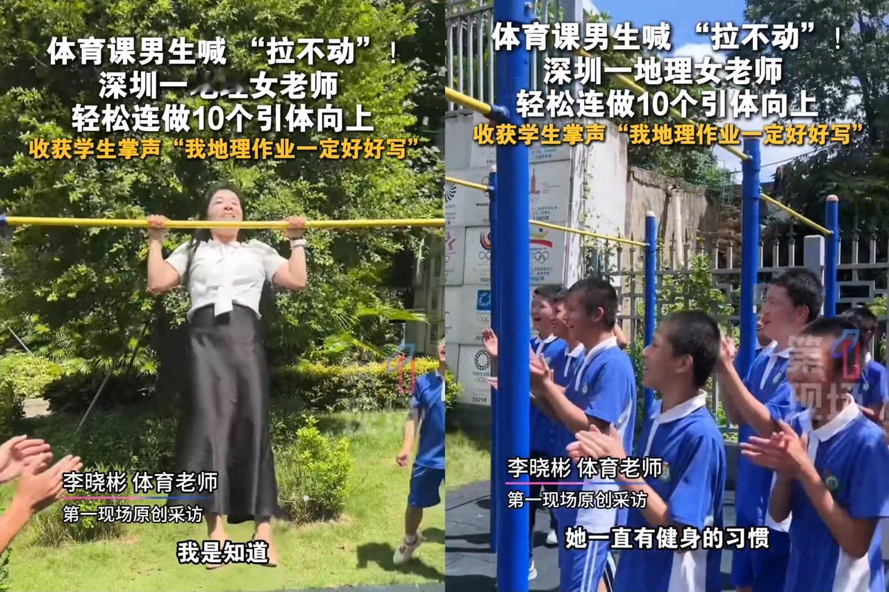 本来体育老师正带着学生练引体向上, 一群孩子围着单杠喊“太难了”, 结果路过的地