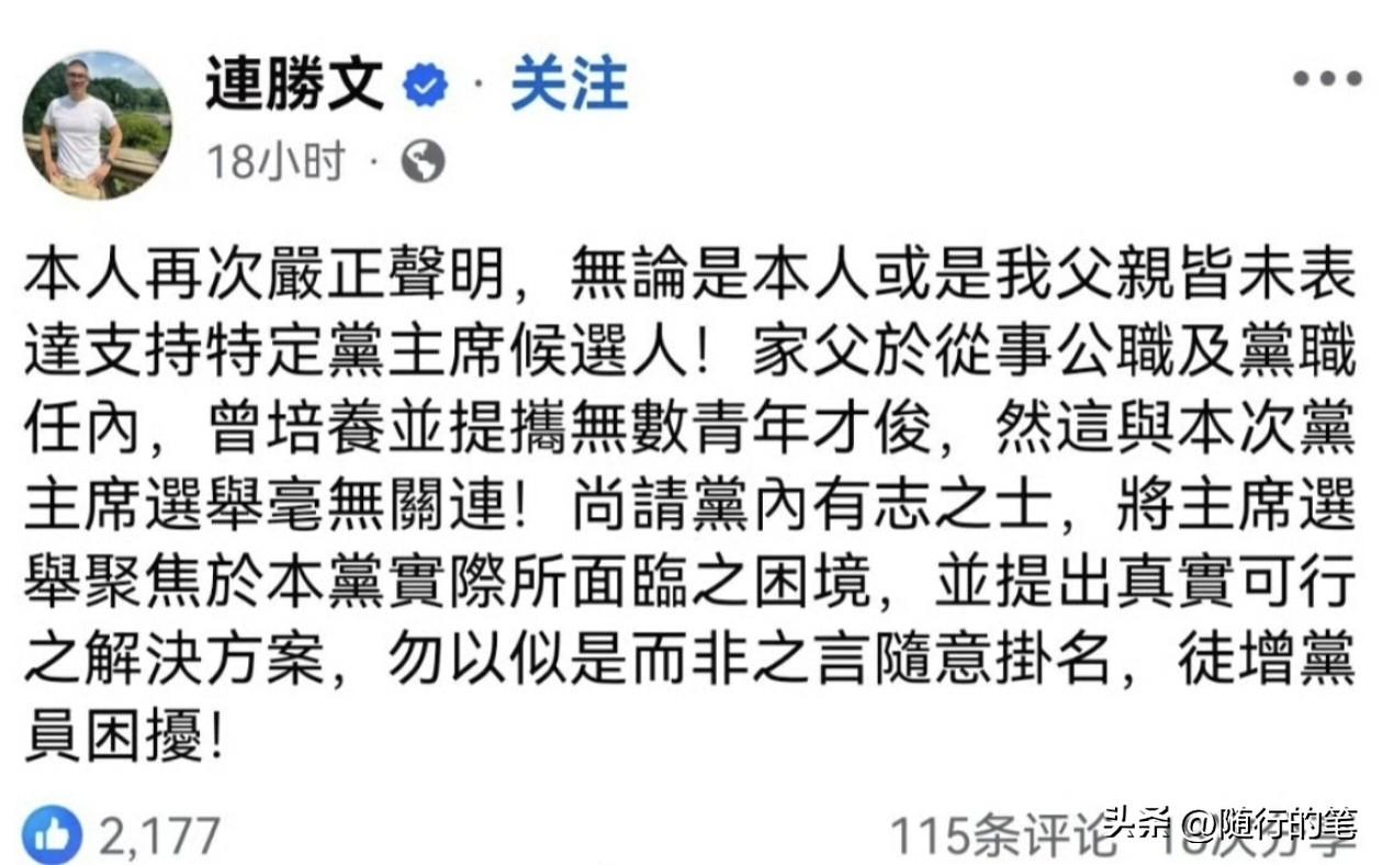 针对张亚中批评郑丽文以前靠连战的言论,连胜文坐不住了,发文表态并没有明确支持哪一个参选人,迅速撇清自己家人无意干预这场竞选。 一个有意思的情况是,到目前为止,参选人之中也只有郝龙斌与罗志强分别得到背后大佬赵少康、马英九的明确支持,郑丽文与张亚中等都要到处拜访拉票。感觉国民党之中的一些重量级人物对这次主席竞选都比较谨慎,除非真的有深厚感情,要不都不会轻易公开表达支持谁。