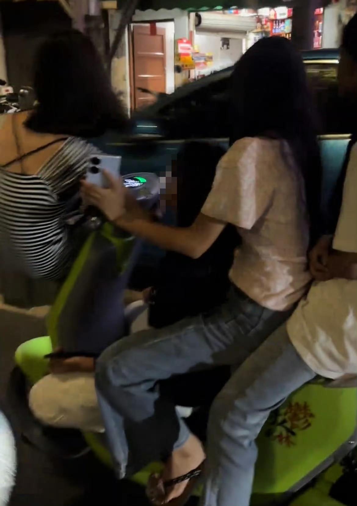 【玉林4人同乘共享电车一人竟坐车筐上】 10月2日晚,有网友在
