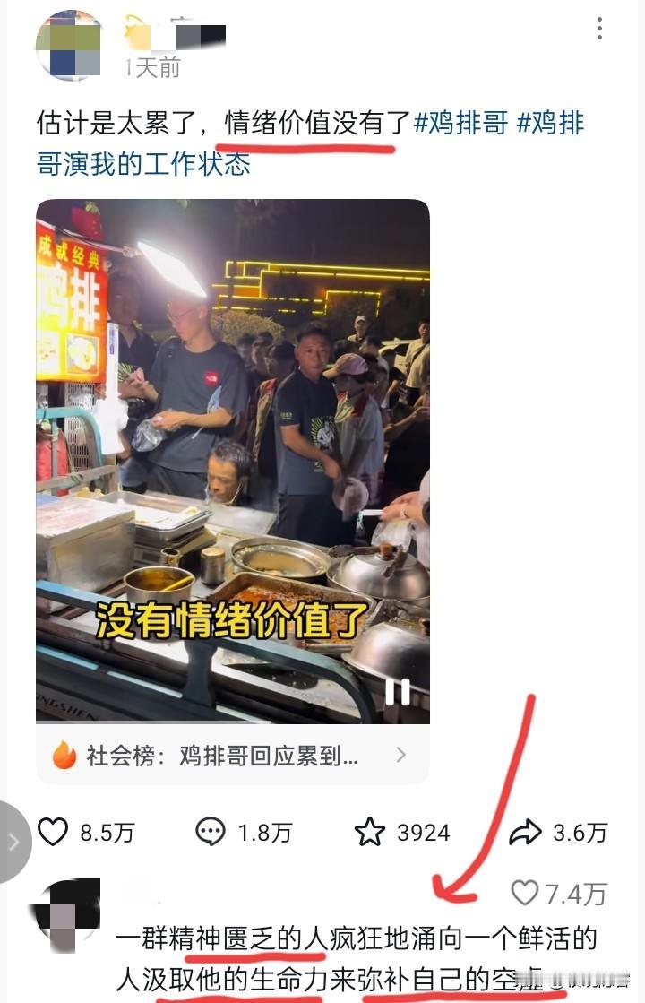 活力满满的鸡排哥怎么变成这样, 虽说有钱赚名气爆火是好事,可是把自己搞成这样真的好吗? 底下评论说的很好,看了视频以后就感觉得出,的确有种一群人如饿狼般汲取原本精神充沛的鸡排哥生命力的感觉。 有人说鸡排哥手臂都是被油溅出来的伤疤,看鸡排哥最新视频也可以知道,他的脸庞好消瘦,已经疲惫得无精打采。 就这样还有人说他怎么不说话,国庆期间去摊位上找他的挤爆了,每天这样高强度的炸鸡排,说话的力气都没有,神仙来了也得累死去。