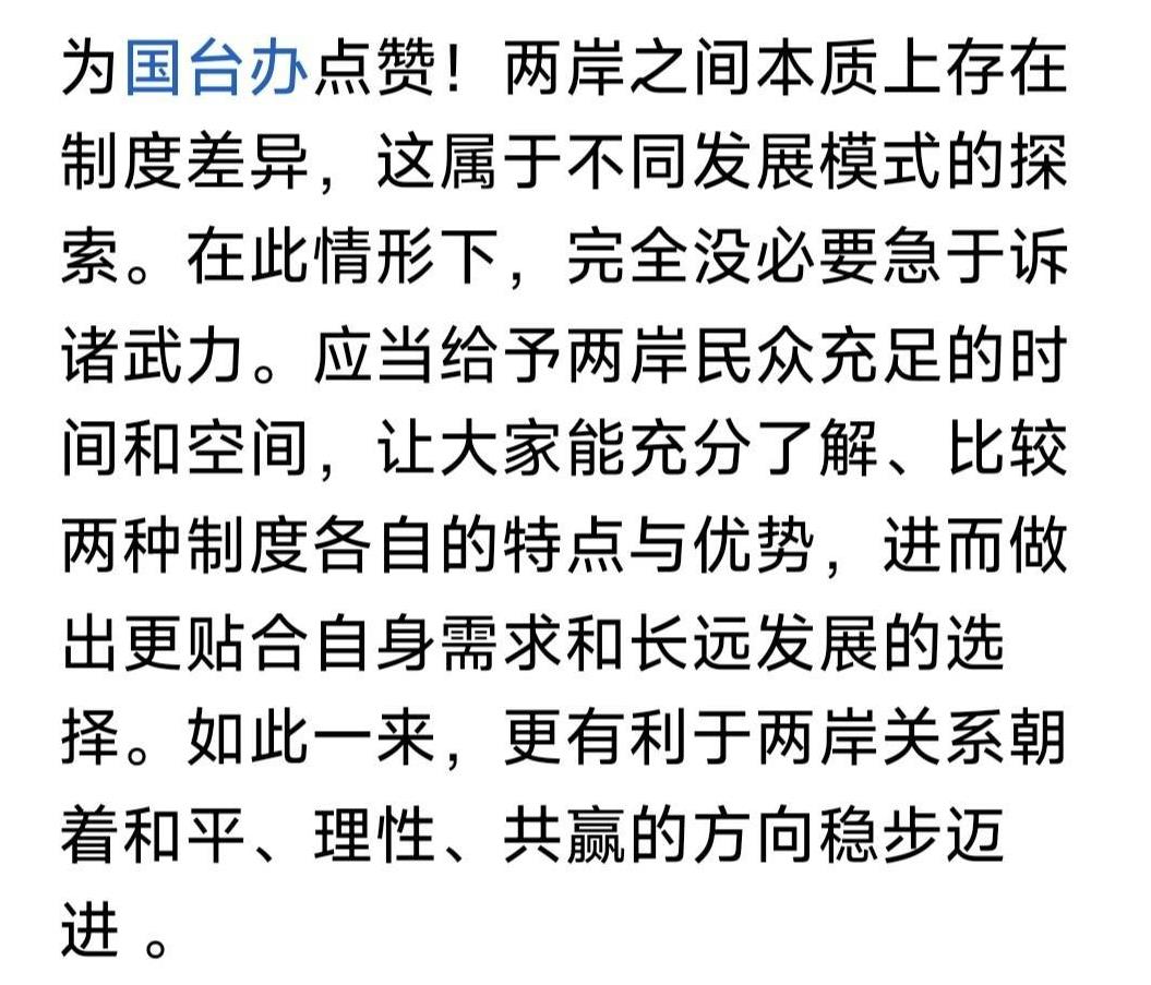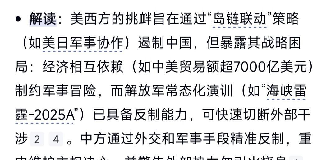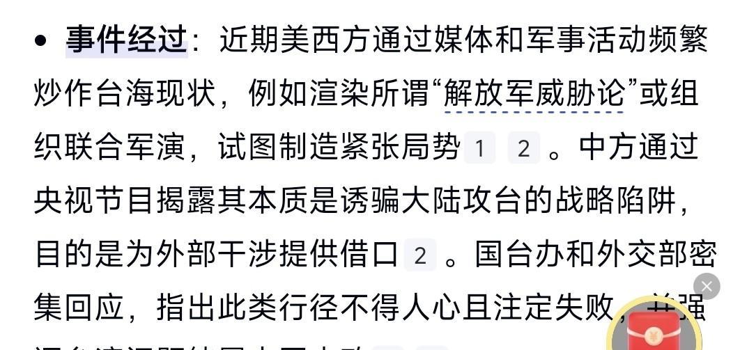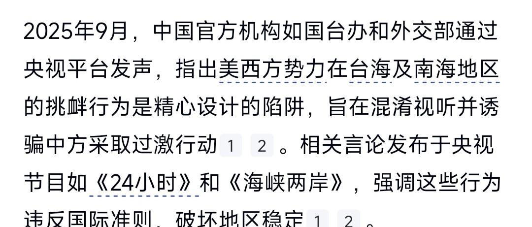 央视:西方在台海挑衅是陷阱!是对中国双重讹诈,企图引发战争,阻断中国持续发展。我们谨慎应对奉陪到底! 央视所言是指近期以来,美西方军舰不断借“自由航行”,穿越台湾海峡,并鼓噪在邻国部署远程雷达,监视中国! 中国军舰对“不请自来客人”,采取伴随拍照取证,导弹锁定,战机模拟攻击等手段,不实弹攻击,予以警告驱离。 网友评论:中国在台海问题备而无患,按兵不动,是十分高明的策略!中国政府强调和平方式实现统一也是如此。 这样做的原因,只有两个方面: 1.台湾与大陆,都是中国人!两岸一家亲,和平统一利国利民。如果用战争解决问题,将使仇者快亲者痛! 2.中国正值深化改革,持续发展关键时刻,一旦因此发生战争,引起国际环境变化,就有可能阻断经济发展,全面进步伟大复兴,不能因小失大! 当然我们也有“反分裂国家法”,这是一条红线!不管是台当局“滑向台独”,还是外部势力公开支持“台独”, 中国就不能迁就忍让,必须坚决出手! 目前中国政府态度,与台湾统派人物基本一致!就是两岸互相体谅宽容大度,温暖感化消除分歧,共同努力实现“和统”!因为这是两岸人民愿望。 但有一个前提:台当局不能走向“台独”!国外势力不能公开支持“台独”!相信台湾当局与西方势力不敢,因为此发生战争,都不是各方愿意看到的! 两岸同属中国!台湾是中国领土不可分割一部分!这是世界共识。期望台湾以和平方式,早日回归中国。两岸人民携手,实现中华民族复兴伟业! …………